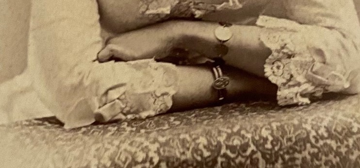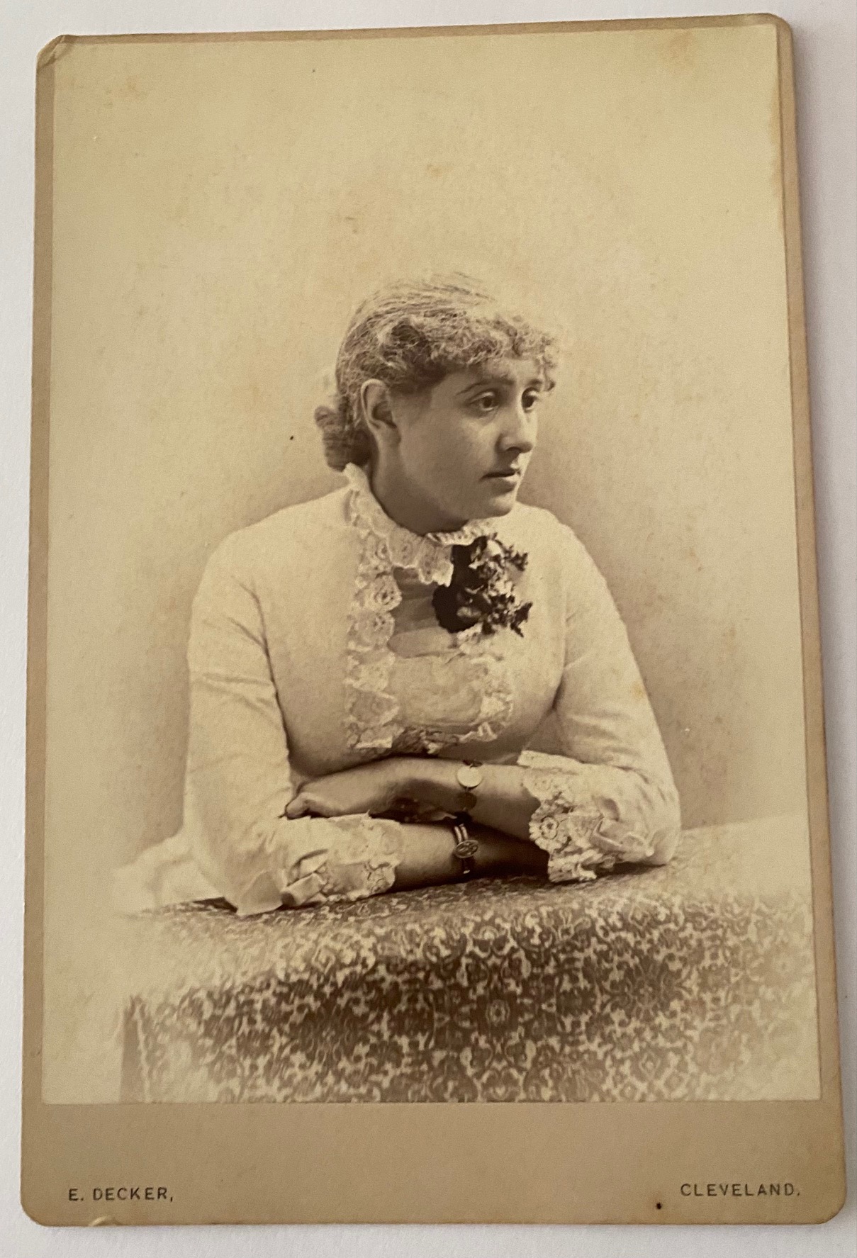 This original cabinet card photograph features a forlorn looking young woman. She is wearing two lovely bracelets. This image was photographed by Edgar Decker (1832-1905). He was one of Cleveland’s earliest and most renowned photographers. Decker was raised on a farm in New York. He grew up to be a shopkeeper. He developed an interest in photography. When he moved to Cleveland in 1857, he went to work in photography studios. After two years of experience, he opened his own studio, which operated for over 40 years. His subjects included many accomplished people including performers, businessmen, and politicians. In fact, Decker photographed four US Presidents, John James Audubon (ornithologist), as well as General William Sherman. In 1862, he photographed encamped Union army soldiers before they left Cleveland to be engaged in the civil war. Decker won many awards in photography competitions. In 1887, he was elected President of the National Photographic Association. He served on Cleveland’s City Council from 1878 through 1882. Decker was succeeded by his protege, George Edmondson. Edmonson became a successful and well known photographer in his own right. (SOLD)