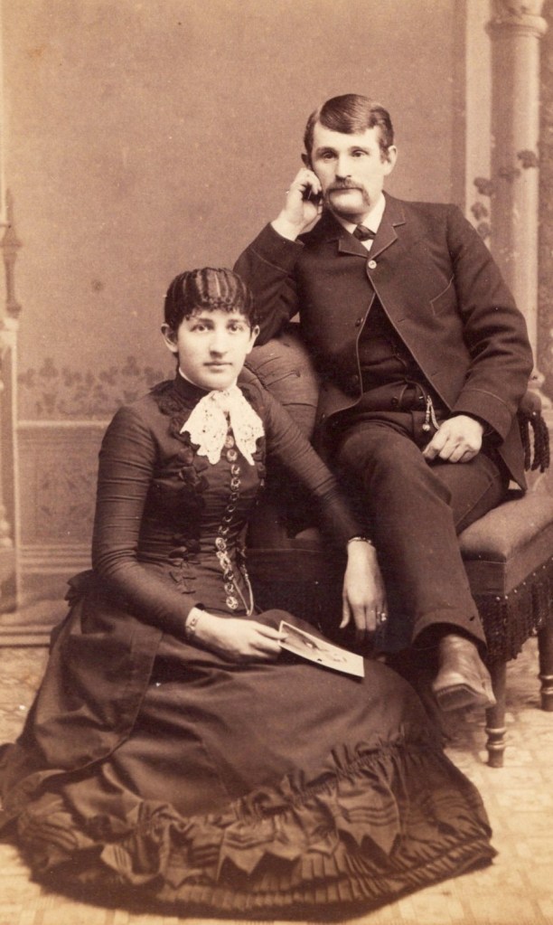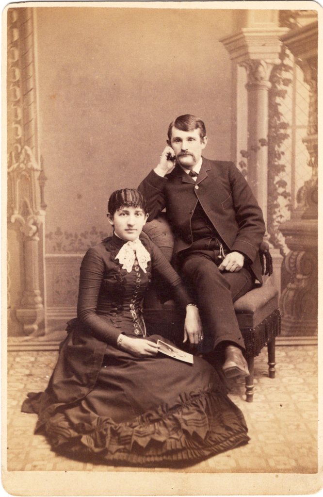 This image was photographed by J. M. Munson of Madison, South Dakota. The photograph was taken after 1889, the date of South Dakota Statehood. Photographs before 1889 would print the location as “Dakota Territory”. The couple in this image are an attractive pair. The woman subject is wearing a pretty dress, a ring, a collar pin and a bow in her hair. The gentleman is well groomed and dressed in a fancy suit. The photographer of this portrait is John M. Munson. He and his family appear in the U. S. Census of 1900. He was working as a photographer and living with his wife and daughter in Madison. He was 50 years old, his wife (Ada) was 41 years old, and his daughter Josephine was 6 years old. He and his wife had been married in 1882. The census indicated that Munson was born in 1849 in Ohio. A 1909 South Dakota business directory lists his Madison photography studio. The 1910 census confirms that he still worked as a proprietor of a photography business and lived with his family. The 1920 census finds Munson unemployed, or retired, and still living with his wife and daughter. (SOLD)