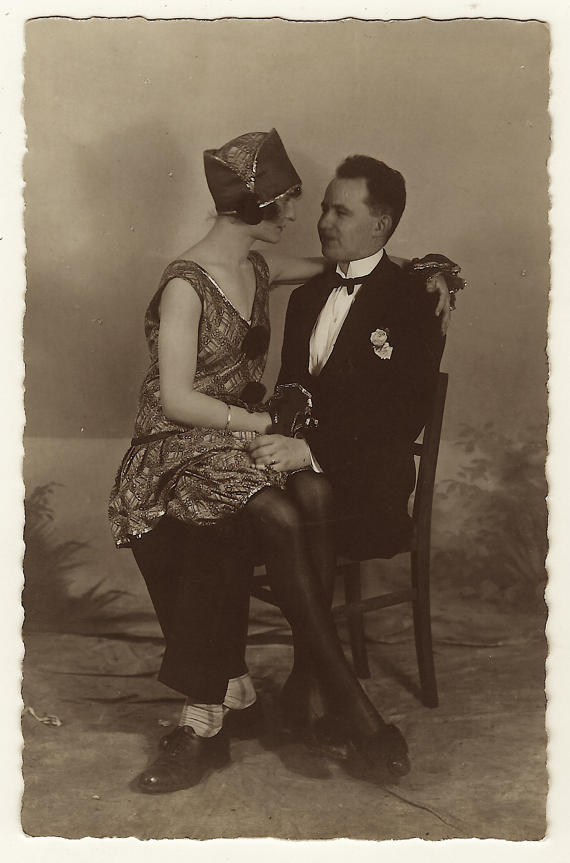 This vintage real photo postcard features a lovely couple posing for their portrait at an unidentified studio. The couple are well dressed and wearing jewelry. This postcard is unusual because the man and woman are holding hands. Private postcards from this era (c 1910’s) seldom showed public displays of attention. I imagine that this couple was so in love that they couldn’t take their hands off each other. At the very least, the man and woman seen in this photo, were unconventional. This postcard is in of French origin and is in very good condition (see scans).