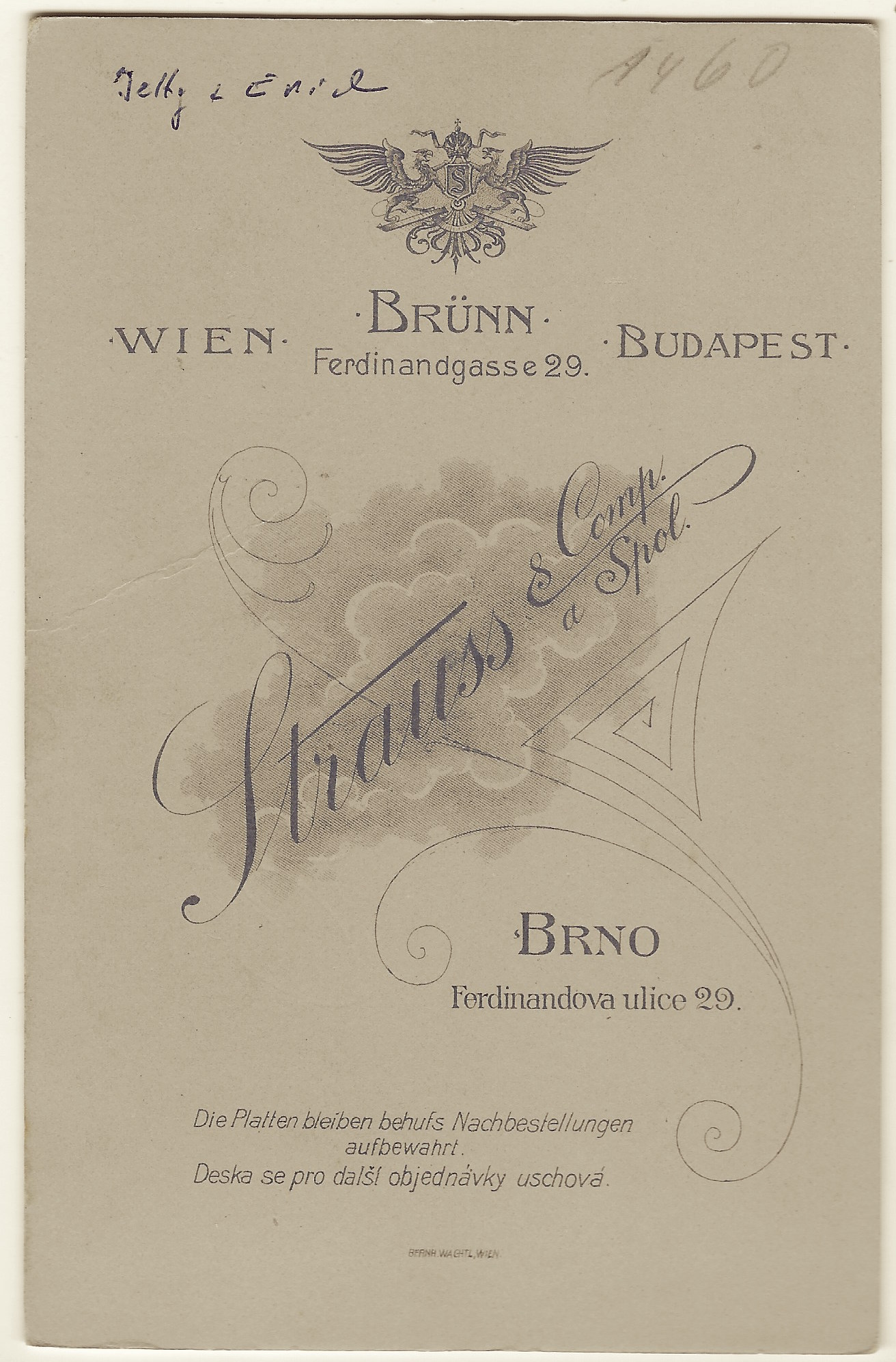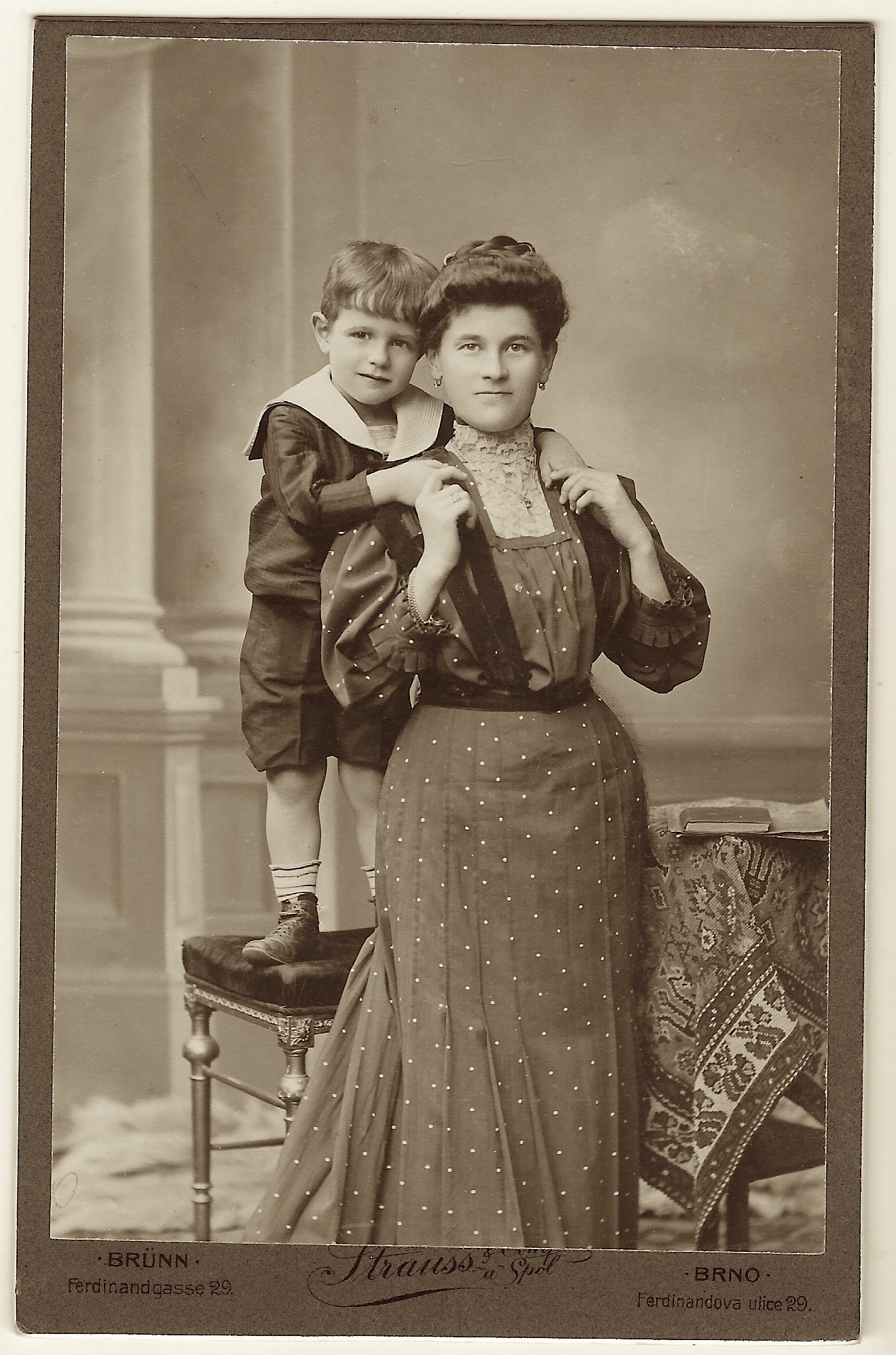 This image is an exceptionally beautiful cabinet card portrait of a pretty mother and her adorable young son. Mom is very well dressed and wearing a necklace, ring, and earrings. She appears confident as she stares at the camera. Her son, standing on a chair, has his arms draped around his mother’s shoulders. He is wearing a nautical type outfit. There is a book on a table in the background. An inscription on the reverse of the photograph indicates that mom’s name is “Jetty” and her son’s name is “Erich”, or possibly, “Emil”. The inscription is difficult to decipher, so the names I provided are just my best guess. The cabinet card photo was taken at the Strauss studio. Strauss had studios in Vienna (Austria), Brunn (Czechoslovakia), and Budapest (Hungary). It is likely that this photo comes from the studio in Brunn. SOLD