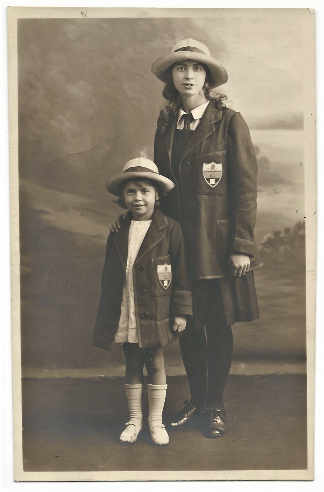 This vintage real photo features two lovely girls wearing their school uniforms. It is likely that they are sisters. The patch on their jackets probably reveals where they attended school. This photo was taken at the Van Ralty Limited Studios. The company operated photo studios in Manchester, Liverpool, Sheffield, Nottingham, Oldham, and Bolton, England. Research uncovered one article that reported that the Van Ralty enterprise was in business between 1911 and 1933, It is unclear if the writer was referring to one of the individual studios or referring to the entire operation. This vintage postcard is in very good condition (see scans). SOLD