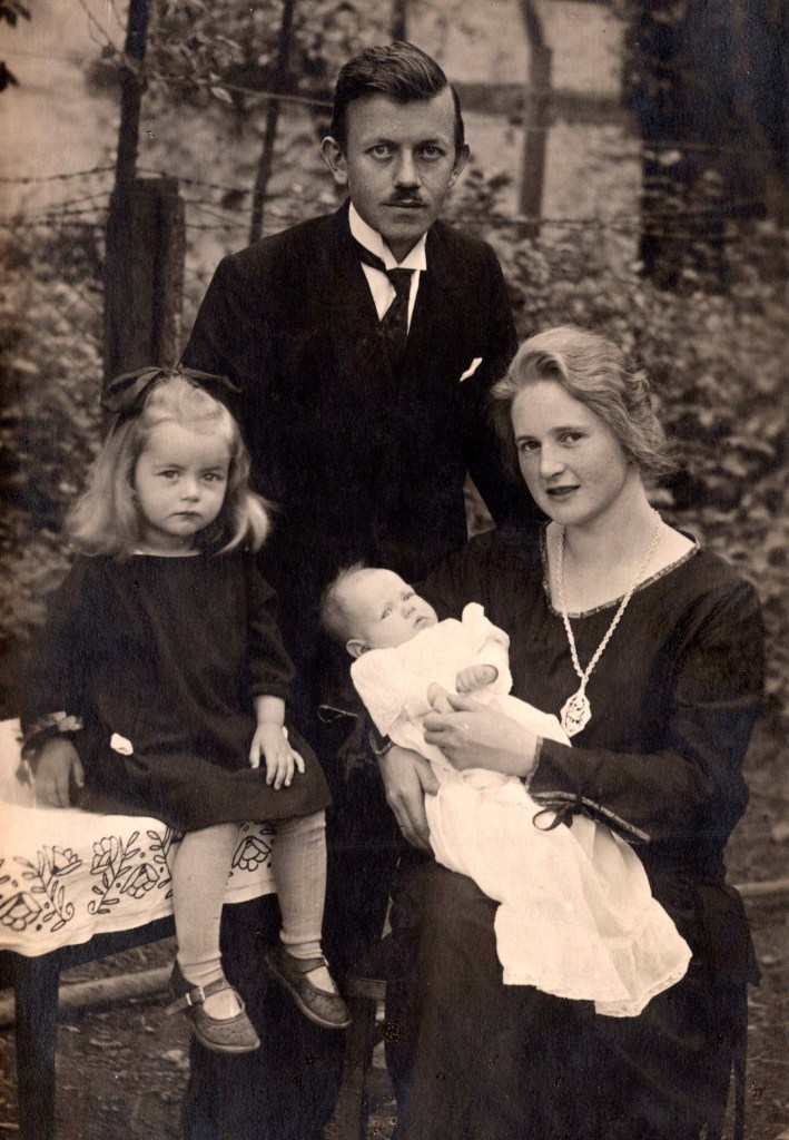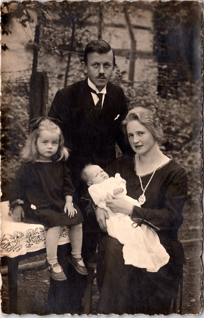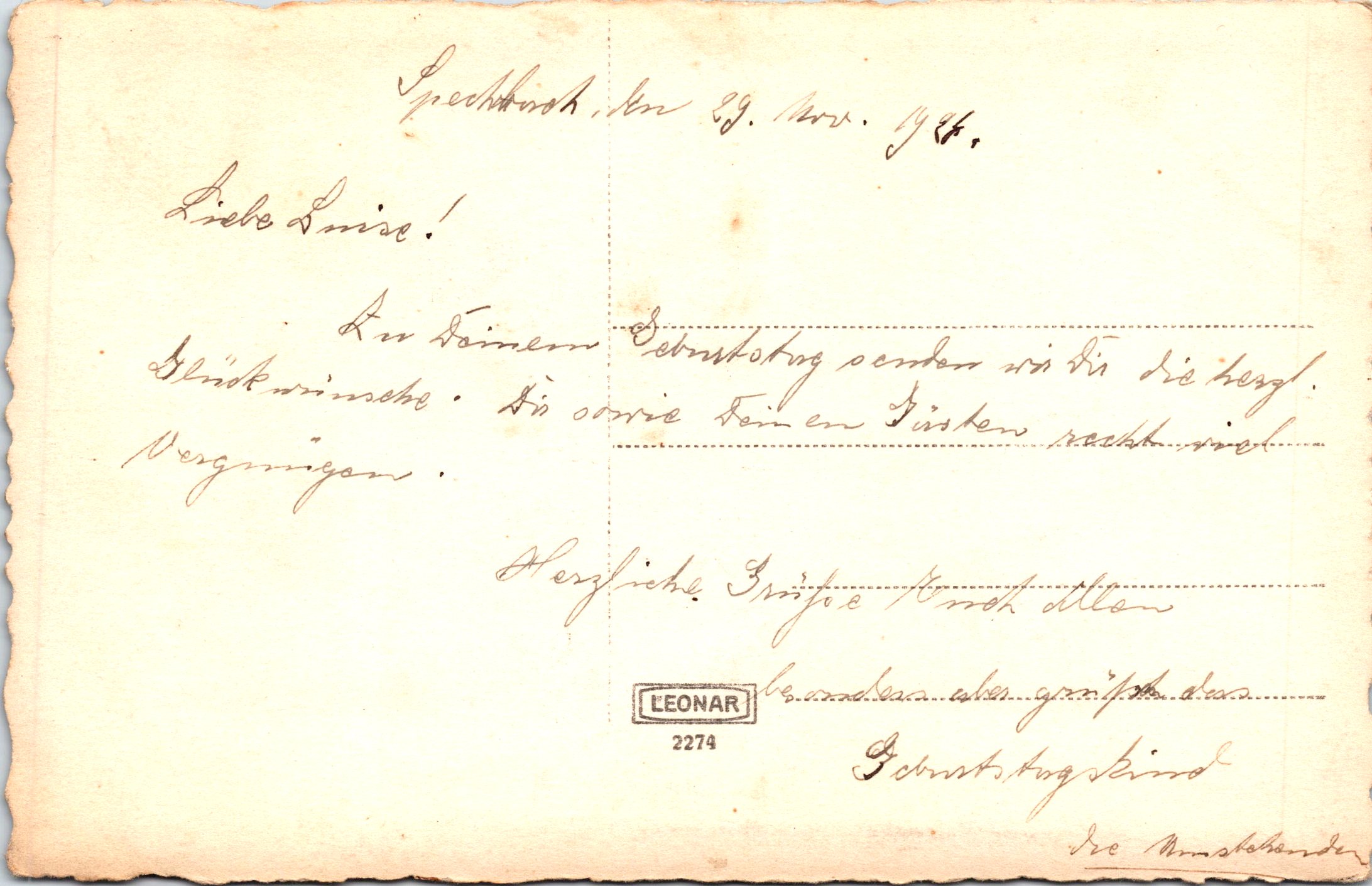 This evocative scallop edged, early 20th-century real photo postcard, presents a carefully posed family portrait, photographed outdoors in what appears to be a wooded park or garden setting. The image depicts a young couple with two children, arranged in a formal yet intimate composition that reflects both affection and dignity. The father, standing behind the group, wears a dark tailored suit with narrow lapels, a stiff white collar, slim tie, and a neatly groomed mustache—hallmarks of late 1910s to early 1920s European men’s fashion. His hair is closely cropped and carefully parted, reinforcing the formal tone of the portrait. The mother, seated at right, cradles an infant in her arms. She wears a dark long-sleeved dress with a modest neckline and a long decorative pendant necklace. Her softly waved hair, worn up but not tightly pinned, is consistent with post–World War I women’s fashion, circa 1919–1923. The older child, a little girl seated at left, appears to be approximately 3–4 years old. She wears a dark dress, light stockings, and strap shoes, with a large bow in her hair. Her direct, serious gaze gives the photograph much of its emotional weight and presence. The infant, likely under one year of age, is dressed in a long white christening-style gown, commonly used for formal portraits and special occasions during this period. The contrast between the dark adult clothing and the infant’s bright garment draws the viewer’s eye to the youngest family member. Overall, this is not a casual snapshot but a deliberately composed, commissioned portrait, intended to commemorate family life during the immediate post-war years. The reverse is divided-back, with a handwritten message in German, written in flowing cursive script. The card is postally unused (no stamp or cancellation). An approximate translation of the message is “Grechwitz (Germany), March 29, Dear Luise! On your birthday we send you our warmest good wishes. For your dear children…Warm greetings” to everyone.” The message is affectionate and familial in tone, suggesting this postcard was sent as a birthday greeting, reinforcing the idea that this portrait held personal significance for the sender and recipient. On the reverse of the card is the printed name “Leonar”. Leonar was a German photographic paper and postcard publisher. The postcard is on Leonar paper but it is not certain that the firm was also the publisher of the card. This vintage postcard is in very good condition. The card has light, even age toning. There is minor edge and corner wear. The image is clear with strong contrast.