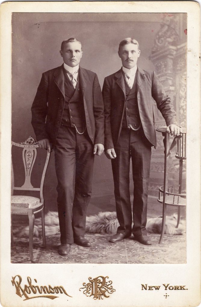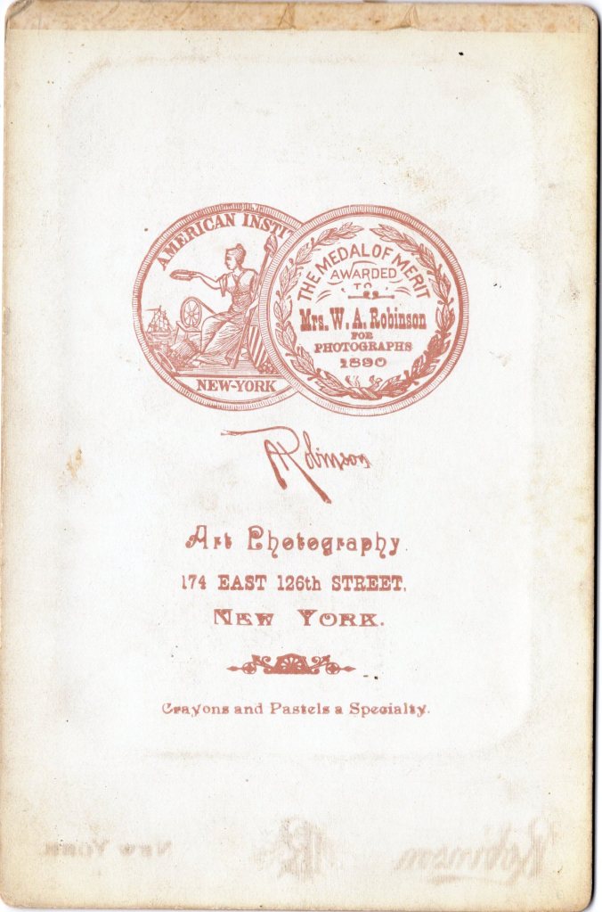 This cabinet card features two elegantly dressed young men posing for their portrait at a studio belonging to Mrs W. A. Robinson. She was a noted artistic photographer who opened a studio in 1889 at the Manhattan address listed on this cabinet card. She later moved to 2320 Third Avenue. She regularly exhibited at the American Institute and won a number of medals. Mrs. Robinson’s husband, William A. Robinson was a prominent photographer in New York City and Chicago. He was partners with Alfred J. Roe. (SOLD)