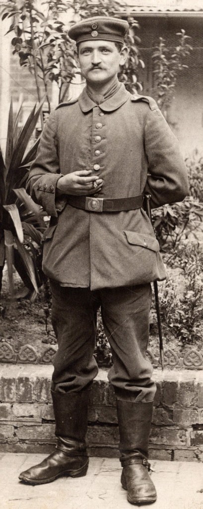 This vintage real photo postcard features a handsome soldier posing for his portrait in front of a garden outside a building. Note his high boots. There are hardly visible tiny bumps (about shoulder high) in this image. Overall, this photo postcard is in good condition (see scans). keyword