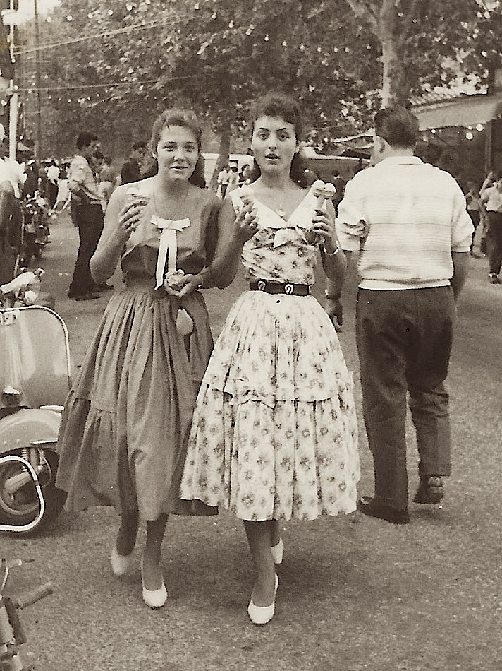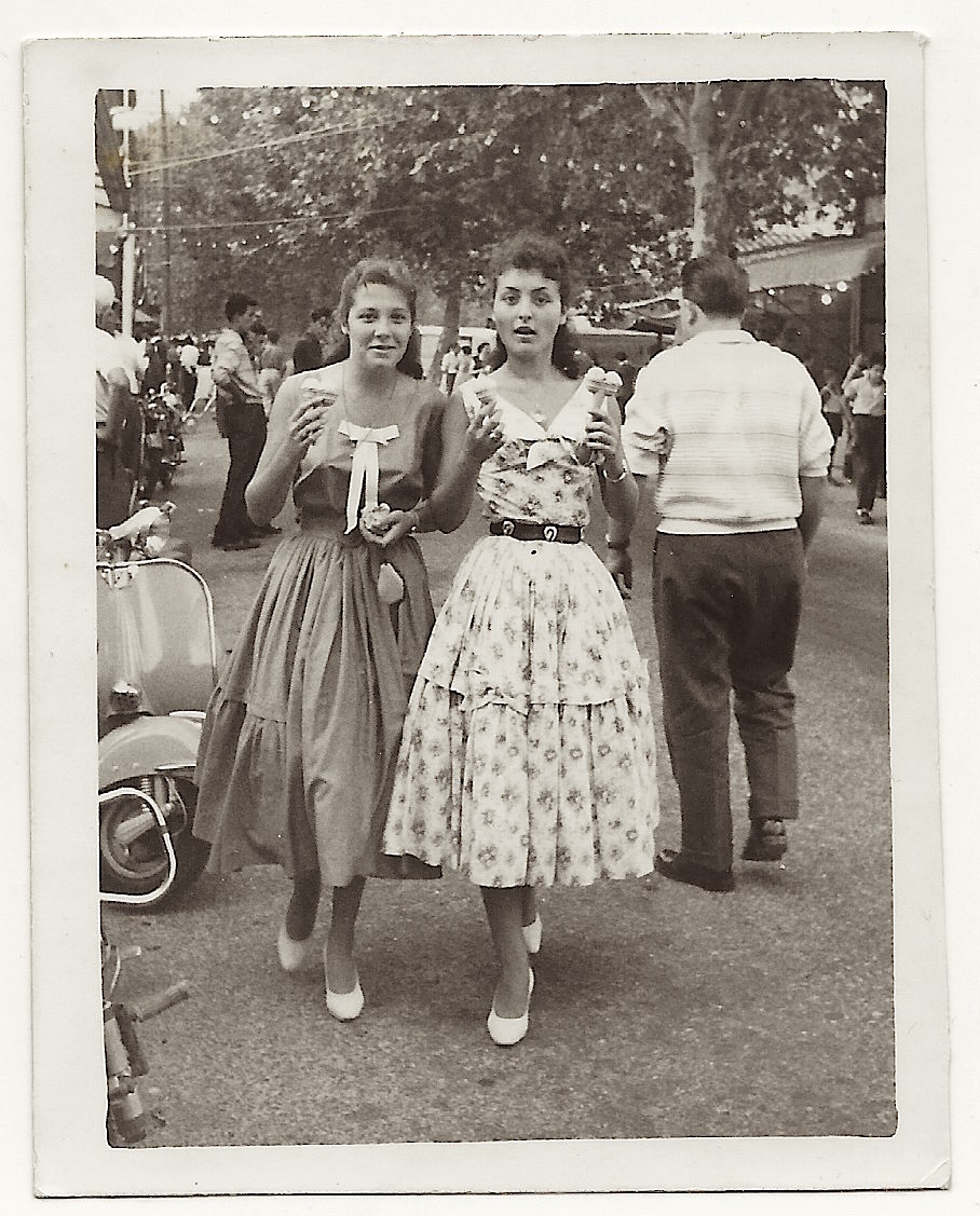 This vintage snapshot features two very pretty young women eating ice cream as they stroll down a street in St. Andre, France. It appears that they may be at a street fair. These thin waisted young ladies could be fashion models. Perhaps they are? Note the Vespa motor scooter that is parked behind the woman wearing the solid color dress. That same woman, has a beautiful smile. An inscription on the reverse of the photograph indicates that the photo was taken in 1957 SOLD