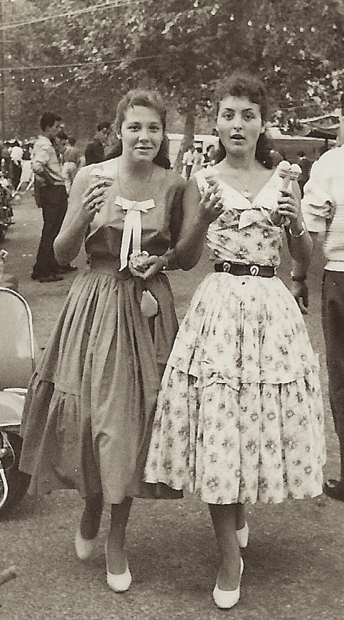This vintage snapshot features two very pretty young women eating ice cream as they stroll down a street in St. Andre, France. It appears that they may be at a street fair. These thin waisted young ladies could be fashion models. Perhaps they are? Note the Vespa motor scooter that is parked behind the woman wearing the solid color dress. That same woman, has a beautiful smile. An inscription on the reverse of the photograph indicates that the photo was taken in 1957 SOLD