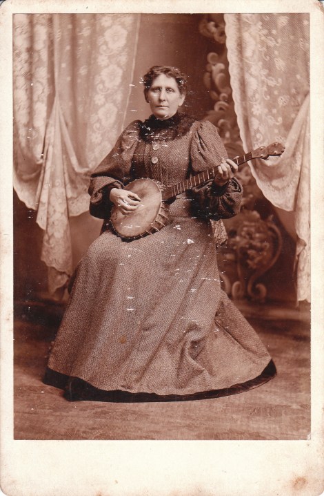 A lady and her banjo are the subject of this cabinet card portrait. She is posed as if she is performing. She sits with the banjo on her knees and curtains draped behind her. Although the photograph is marred by age, it is still a spectacular image because it captures the role music played in home entertainment at the turn of the nineteenth century. The performer and the photographer are unidentified. SOLD