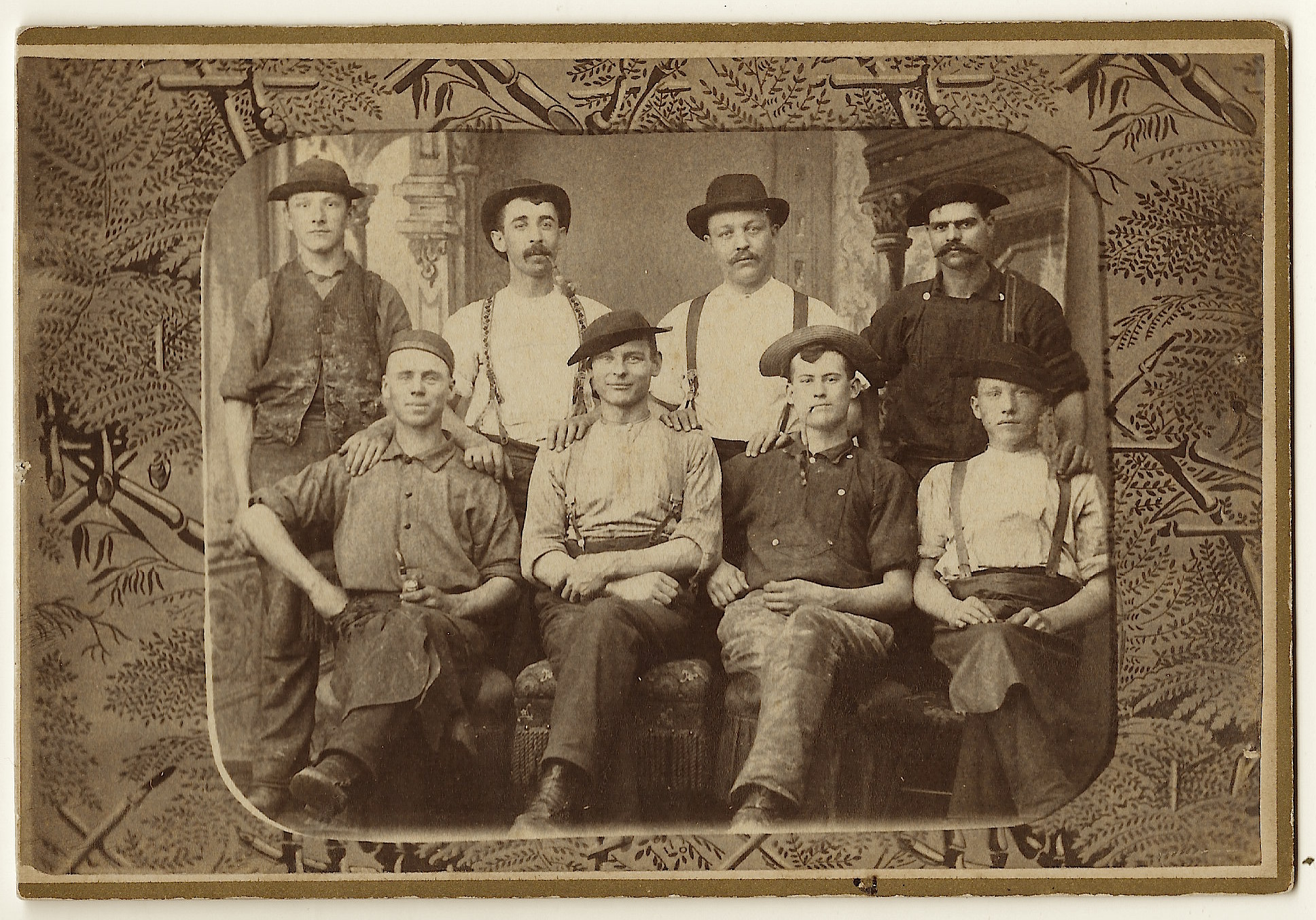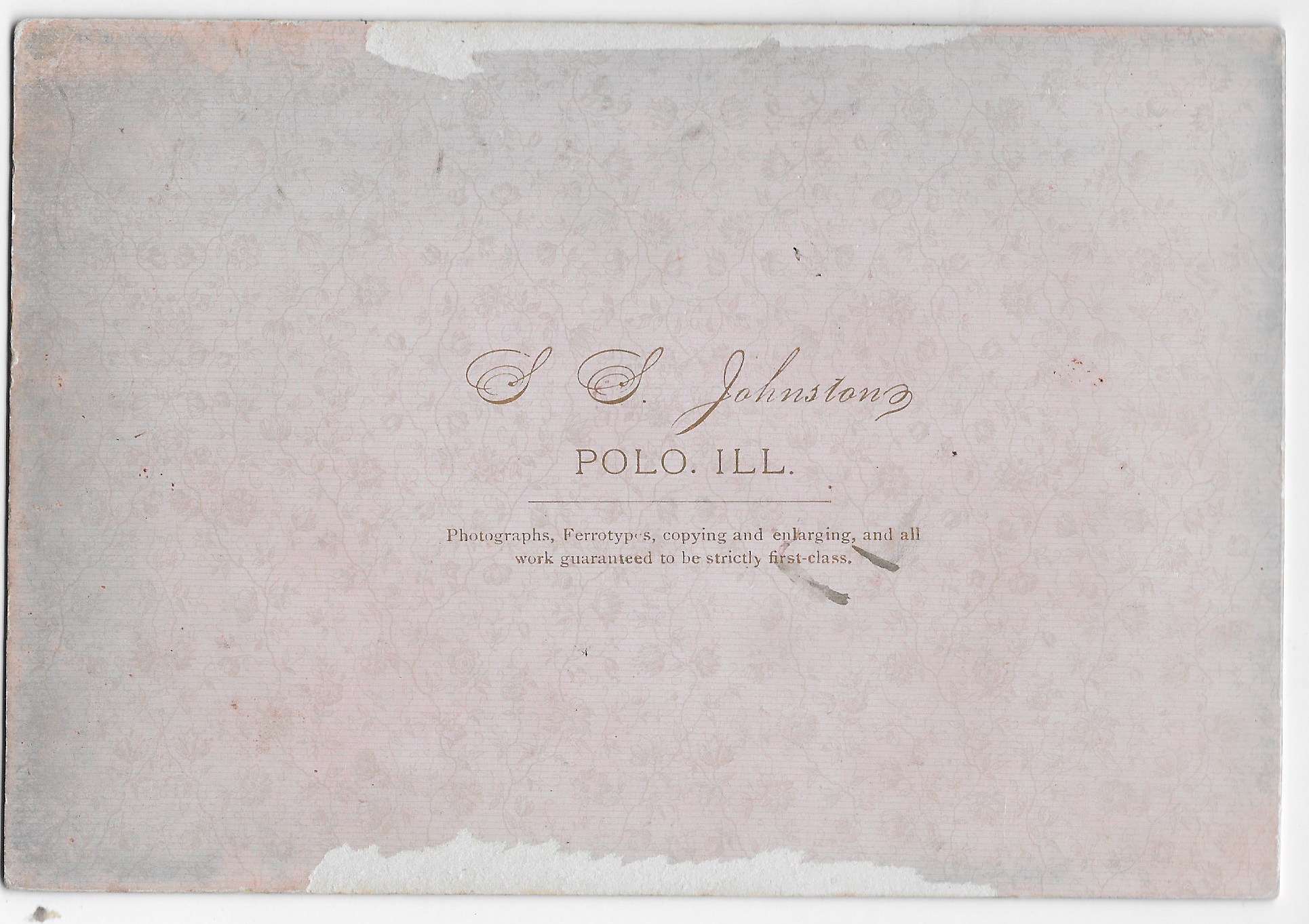 Eight good old boys pose for their portrait at the studio of Samuel S. Johnston in Polo, Illinois. These fellows are dressed like they are workers. Their work clothing includes a various assortment of hats and many of the guys are wearing suspenders. It is apparent that these men are not desk workers. They clearly have jobs requiring physical effort. Samuel Johnston was born in Ohio in 1826. His name appears in the 1870 census and he is listed as a photographer living in Polo. His name and photography business also appear in a number of business directories from the 1870’s. Sam was married to Sarah J. Johnston. The town of Polo was named after Marco Polo. The town was incorporated in 1876. ADDENDUM: The buyer of this cabinet card was the great-grandson of one of the men in this photo. He reports that his great grand dad was a buggy maker and the other men in the photograph were his co-workers. (SOLD)