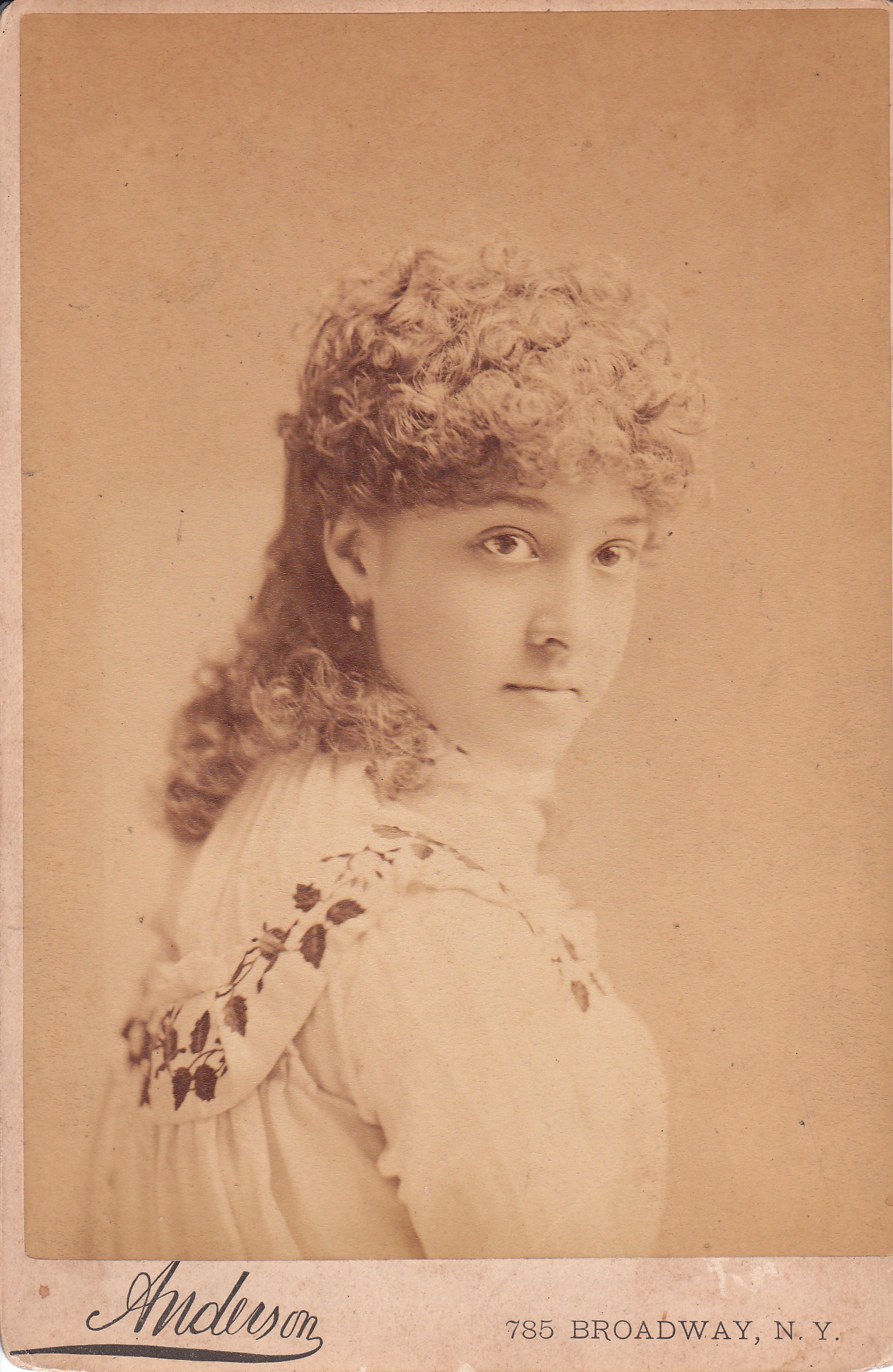 A young woman poses for her portrait at the studio of Anderson, in New York City. She is beautifully dressed and extremely attractive. Unfortunately, she is unidentified. It is likely that a woman with such great beauty and poise, photographed by celebrity photographer, D. H. Anderson; is an actress. There is a name written on the reverse of the cabinet card. The handwriting is not clearly legible but it appears to say “Marjorcni”. Research has yielded no relevant information pertaining to identifying this image. Assistance in identifying the person in this photograph would be appreciated. The knowledgeable and helpful visitors to the cabinet card gallery have solved a number of similar mysteries in the past.