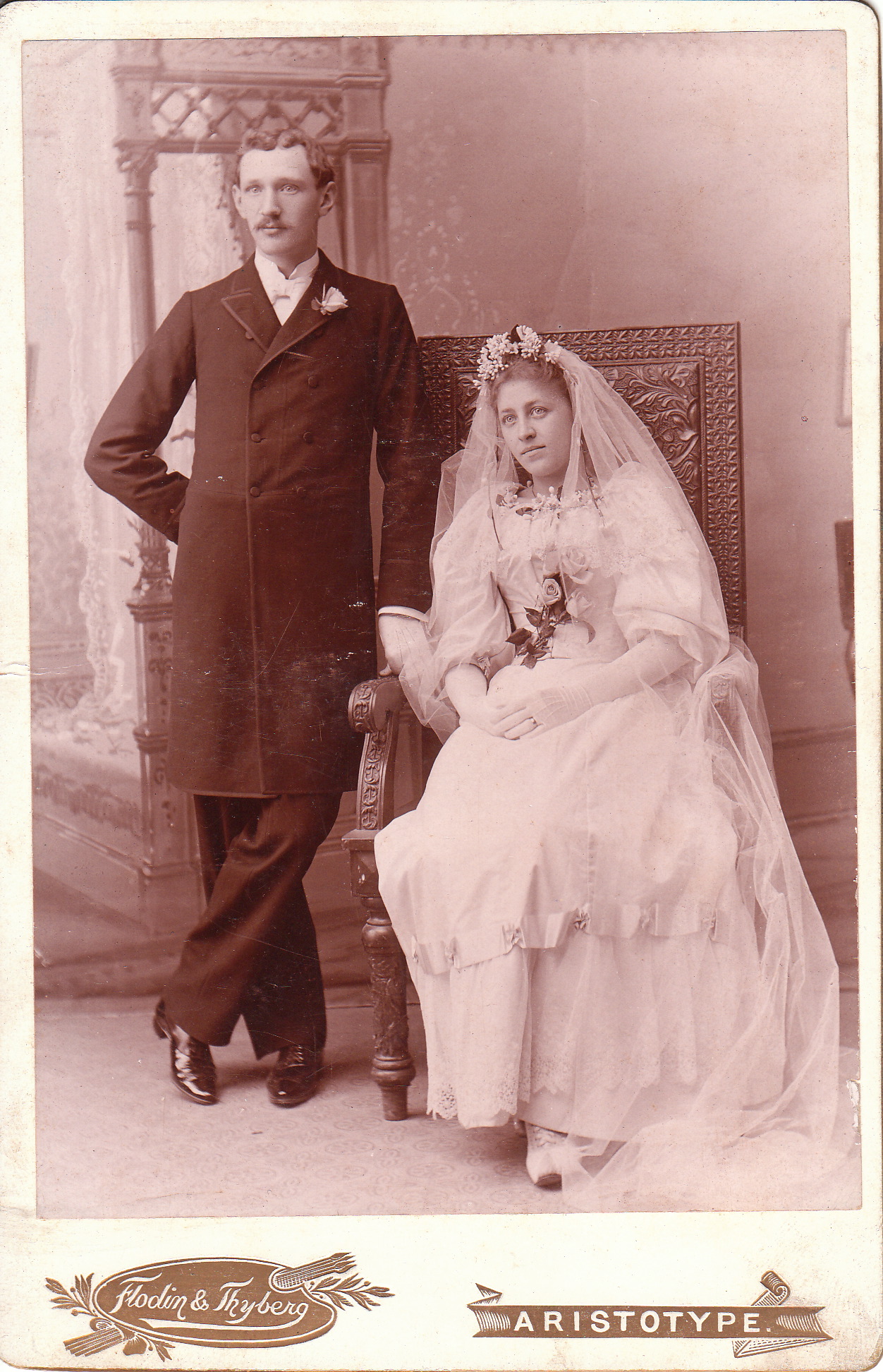 This cabinet card is a family portrait of a nicely dressed young couple and their baby. Mom and dad are wearing flowers and mom appears to be holding a cane or umbrella. The photograph was produced by the Flodin & Thyberg Photographic Art Studio in Worcester, Massachusetts. The photograph is dated 1889. Photographer, Ferdinand Flodin was born in Stockholm, Sweden in 1863.He came to America in 1883 and studied photography in Boston with a well known photographer named Ernest Ritz. He then studied under renowned Boston photographer, William Notman. He moved to Worcester in 1887 and partnered with August Thyberg in opening a gallery. After a time, Thyberg withdrew from the business. Flodin was a very productive writer. He had several articles published in photography journals. He also wrote an illustrated book on Sweden. In addition, he wrote an article which appeared in “Photographic Mosaics: Annual Record of Photographic Progress” (1895). The article was entitled “Our Reception-Room Showcase”. The Wilson Photographic Magazine (1903) reported that Flodin returned to Sweden in 1898 and operated a studio in Stockholm. The magazine article includes some excellent photographs of the Swedish gallery. August Thyberg was born in Sweden in 1863. He immigrated to the United States in 1884. His wife, Alma, was also Swedish. The United States census provides further information about Thyberg. In 1900, he was living in Minneapolis, Minnesota, and working as a merchant. In 1910, he lived in Springfield, Massachusetts and worked as a blacksmith. In 1920, he lived in Minneapolis and owned a shoe business. The 1930 census finds Thyberg retired in Minneapolis. It is safe to say, that unlike his one-time partner, Flodin; Thyberg had a difficult time sticking to an occupation. To view more photographs by this studio, click on the category “Photographer: Flodin & Thyberg. (SOLD)