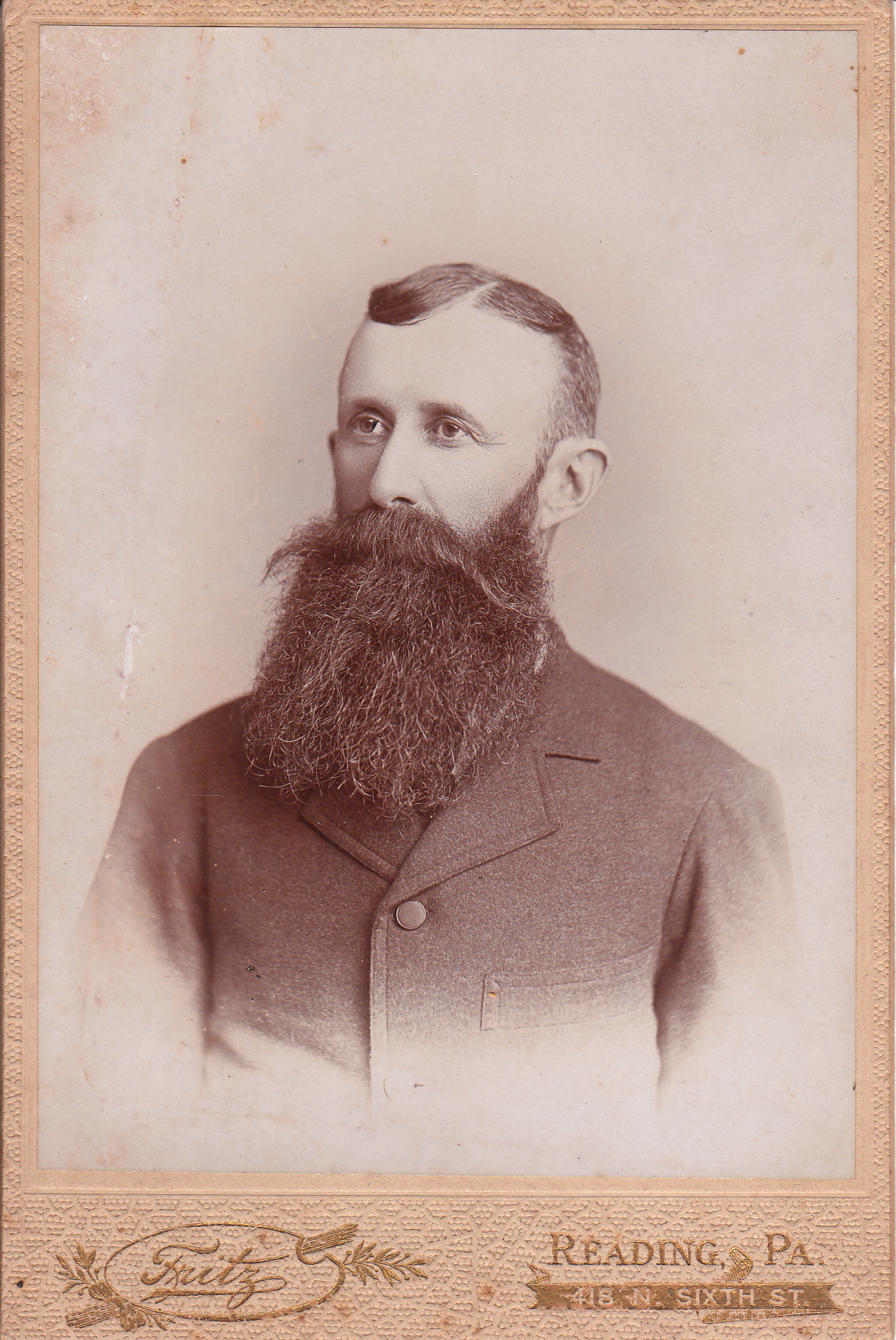 Photographer J. S. Fritz photographed this portrait of a man with a beard. This beard is no ordinary beard. This beard is extraordinarily thick. His mustache is also not ordinary. This mustache is extraordinarily long. The photographer of this cabinet card hotograph is John S. Fritz. He was born on his father’s Pennsylvania farm in 1861. He left home at 15 to work in Philadelphia and while there, learned photography. He then worked with his brother in law as a traveling photographer. He left the business to pursue other occupations and he worked in both Atlantic City, New Jersey, and Philadelphia. He returned to photography and at some point operated a photography studio located at 852 Penn Street in Reading. He was married to Elizabeth Apffel and had at least three children. SOLD