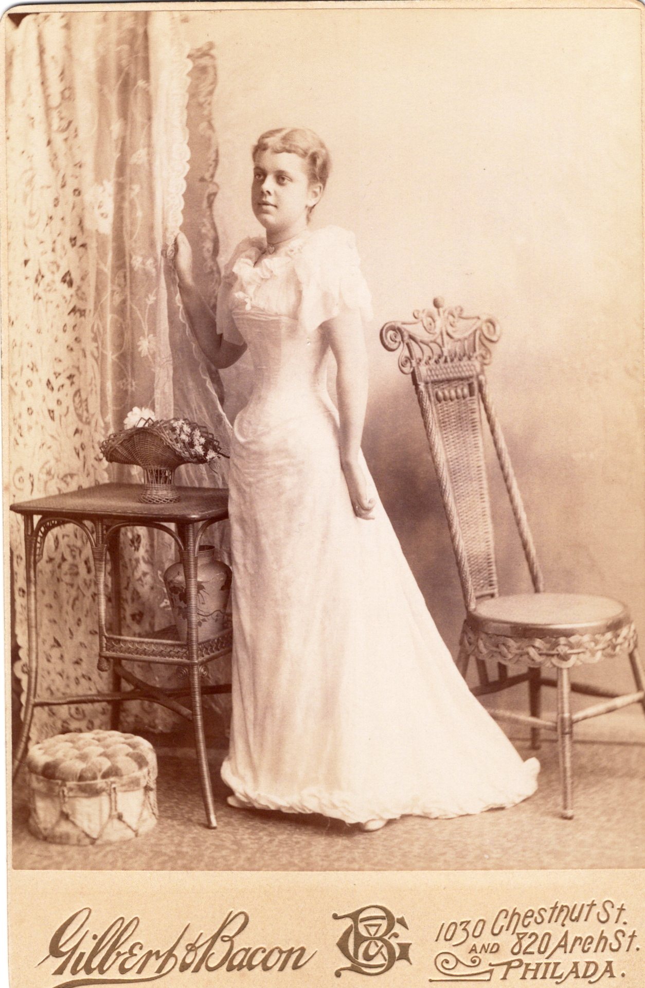 This cabinet card portrait features a pretty young girl dressed in a formal gown. The manner in she is dressed strongly suggests that she is being photographed in connection with a religious ceremony. Her appearance is also suggestive of her being a bride.This photograph was taken at the Gilbert & Bacon Studio in Philadelphia, Pennsylvania. This studio was well known for their quality work as well as their work with local and visiting celebrities. This cabin card portrait is in very good condition (see scans).