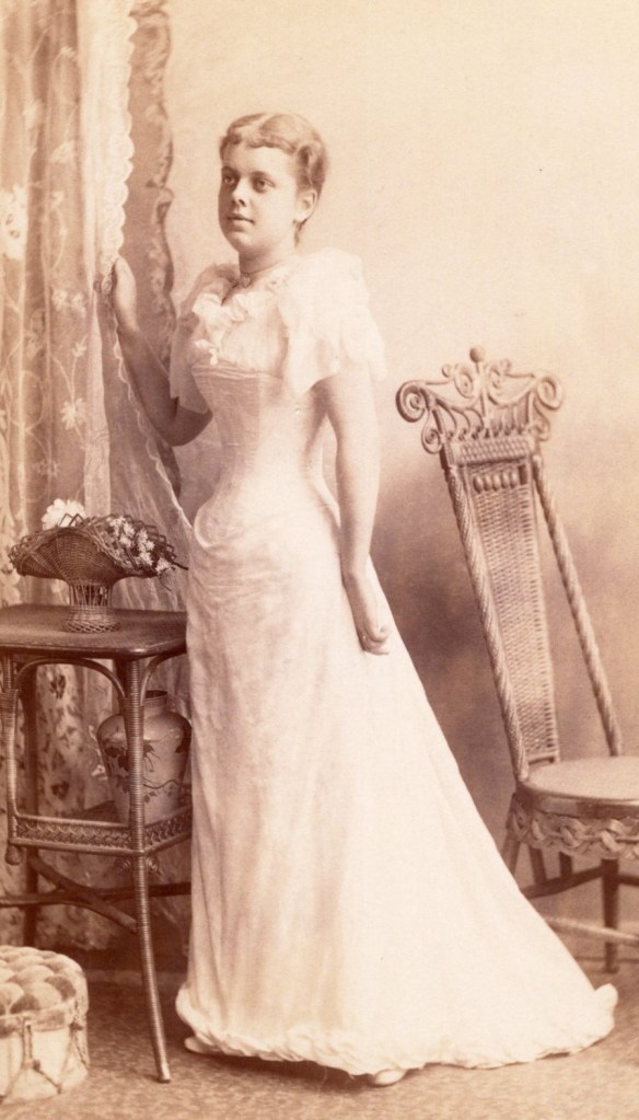 This cabinet card features a very fashionable lady, posing for her portrait at the studio of Gilbert & Bacon, in Philadelphia, Pennsylvania. The woman is identified as Mary Coley (her name is written on the reverse of the photograph). She looks great in her beautiful gown. Note the fur trim at her collar and near the bottom of her dress. She appears to be wearing pearls and she strategically placed her hat at just the right angle, in order to make some sort of fashion statement. This pretty woman may be an actress; Gilbert & Bacon were prominent theatre photographers in Philadelphia. However, research found no record of any actresses named Mary Coley. To learn more about the photographers of this cabinet card, click on the category “Photographer: Gilbert & Bacon”.