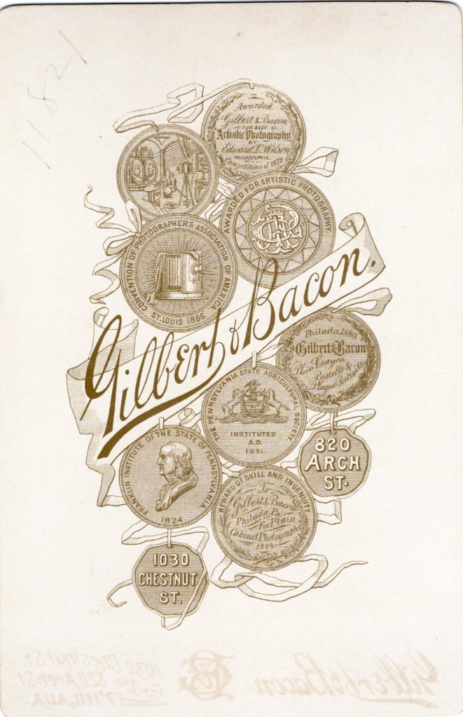 This cabinet card portrait features a handsome man with a wiry beard. His beard qualifies him to enter the cabinet card gallery’s category “Beards (Only the Best)”. Click on the category to see an interesting photographic collection of men with notable beards. This photograph was produced by the Gilbert & Bacon studio in Philadelphia, Pennsylvania. To view other photographs by this studio and to learn more about the photographers, click on the category “Photographer: Gilbert & Bacon”.