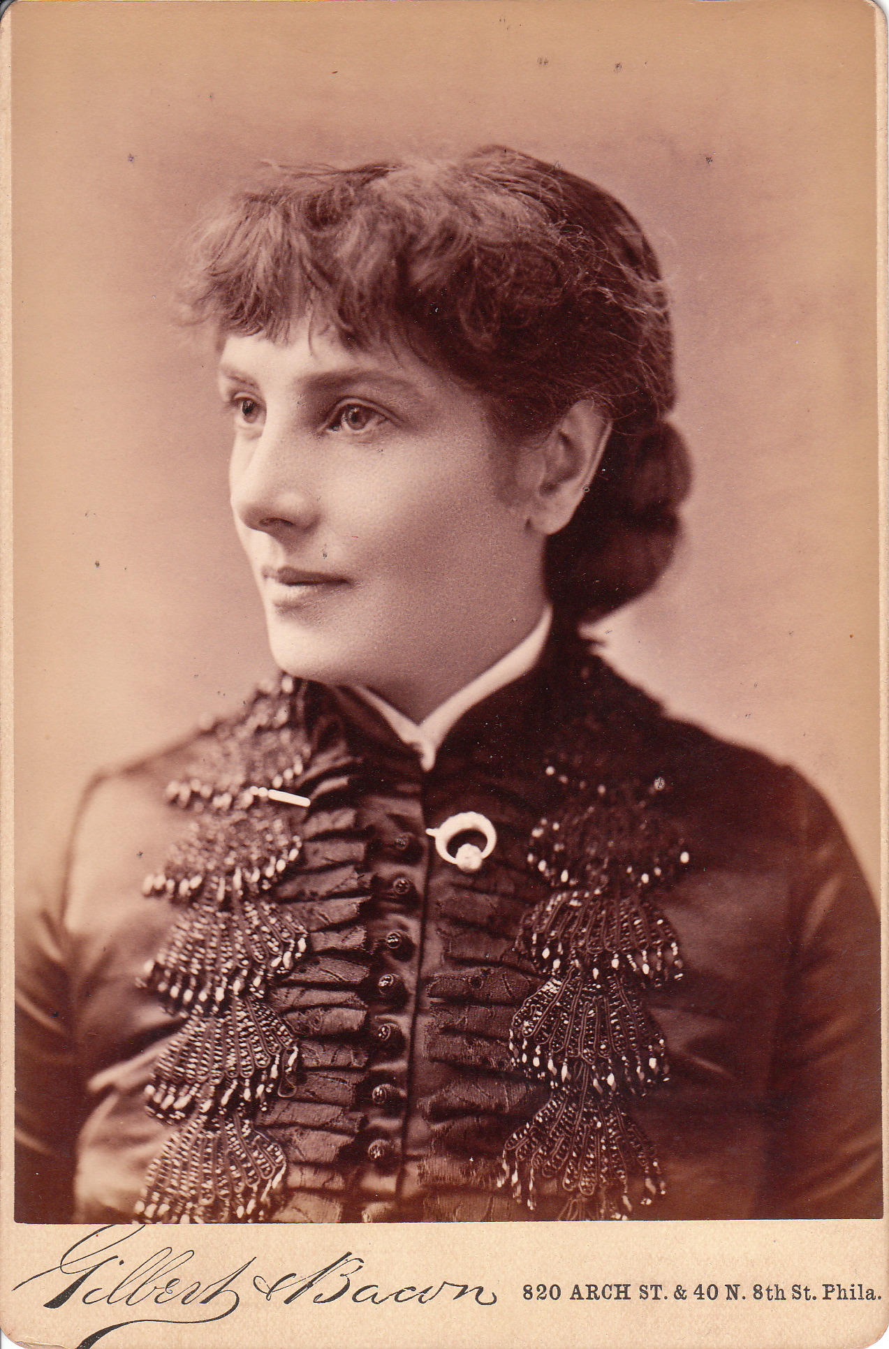 This cabinet card features a very fashionable lady, posing for her portrait at the studio of Gilbert & Bacon, in Philadelphia, Pennsylvania. The woman is identified as Mary Coley (her name is written on the reverse of the photograph). She looks great in her beautiful gown. Note the fur trim at her collar and near the bottom of her dress. She appears to be wearing pearls and she strategically placed her hat at just the right angle, in order to make some sort of fashion statement. This pretty woman may be an actress; Gilbert & Bacon were prominent theatre photographers in Philadelphia. However, research found no record of any actresses named Mary Coley. To learn more about the photographers of this cabinet card, click on the category “Photographer: Gilbert & Bacon”.