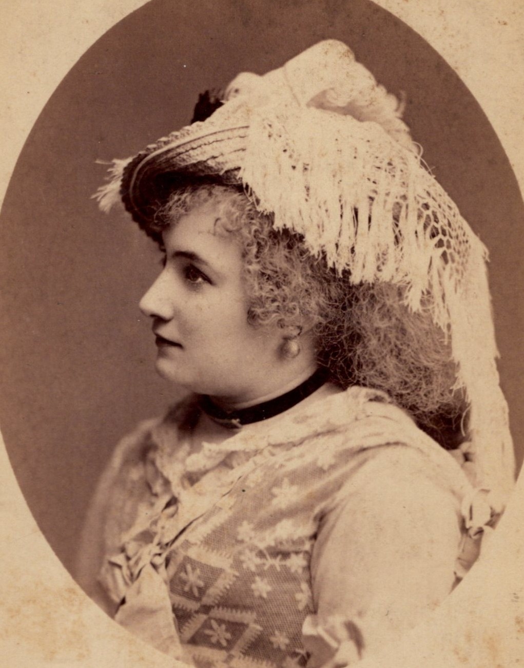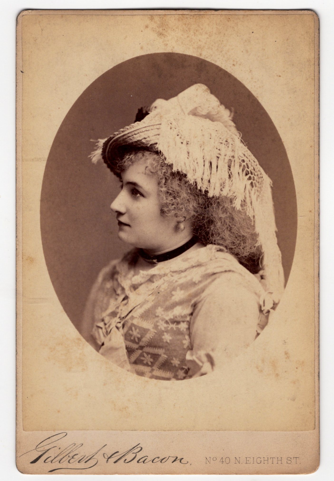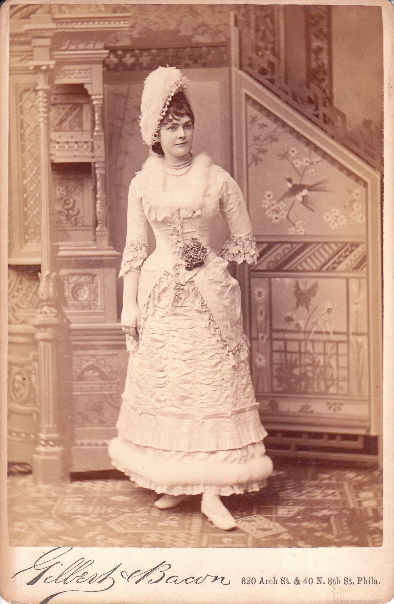 Cabinet Card 1 features early theatre actress, Jennie Winston. Unfortunately, biographical information concerning Ms. Winston appears to be sparse, and further research is necessary. An 1881 publication reveals that Jennie Winston was a native of Scotland and moved to Australia to join W. S. Lyster’s Italian Opera company. Her tenure with this company was seven years. She next went ot America under engagement to “Mr Maguire”, for whom she worked for one season’s duration. She then formed her own traveling opera company which journeyed to the western United States and British Columbia. The “Dramatic News” described Winston as “unsurpassed as a comic-opera artist by anyone in this country”. The photographer of this portrait was the studio belonging to Gilbert & Bacon. This studio was well known for their quality work as well as their work with local and visiting celebrities. To view other photographs by this studio, click on the category of “Photographer: Gilbert & Bacon”.