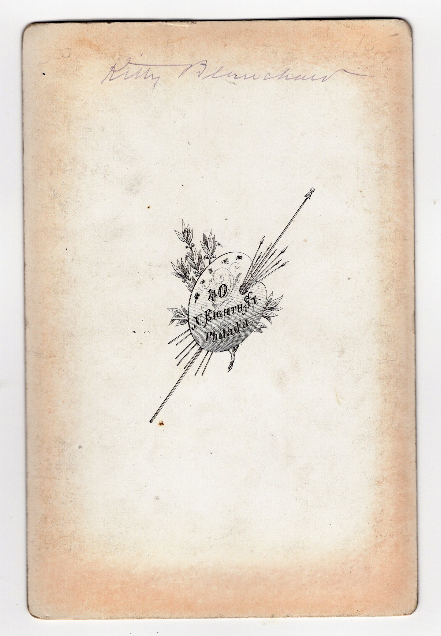 This striking cabinet card presents Kitty Blanchard, a prominent American stage actress of the late 19th century. Seated in a confident pose, she is dressed in an elegant dark dress that hints at late Victorian fashion, with a fitted bodice and high collar, possibly made of velvet or a similar rich fabric. The neckline is modest, and the detailing is ornate yet refined, suggesting both stage presence and social grace. A subtle brooch or decorative element rests at her throat, drawing the viewer’s attention to her carefully arranged appearance. Her hair is styled in a voluminous upswept fashion, typical of actresses of her era, and her expression is composed, intelligent, and slightly reserved—conveying the self-assurance of a seasoned performer. There’s a maturity and dignity in her face that speaks of both artistic discipline and personal resolve. Her overall appearance is poised, polished, and unmistakably theatrical. Kitty Blanchard was a well-known American actress born circa 1850, likely in New York. She enjoyed significant success in the 1870s through the 1890s, often cast in melodramas and character roles that required both emotional intensity and comedic timing. She was married to William A. Mestayer, a fellow stage actor and playwright. The two frequently worked together and were regarded as a respected couple in theatrical circles of the time. Blanchard was best known for her roles in popular touring productions of melodramatic favorites such as “The Galley Slave” and “The Two Orphans”—the latter being one of her most memorable parts, where she often played the devoted sister. She was also admired for her comedic ability, particularly in domestic farces and sentimental comedies. Kitty Blanchard passed away in 1912, closing the curtain on a long and respected theatrical career. Though she never achieved national superstardom, she held a solid and admirable place in 19th-century American theater, especially as a stalwart of the traveling stage companies that brought culture to towns across the country. This cabinet card was produced by the esteemed Philadelphia photographic firm Gilbert & Bacon, one of the most prolific studio partnerships of the late 19th and early 20th centuries. The studio was originally established by Charles M. Gilbert, who later partnered with William F. Bacon around 1875. Together, they operated a prominent photography business specializing in theatrical portraits, society figures, and portraiture of prominent Philadelphians. Gilbert & Bacon became known for their technical skill and their ability to capture the charisma of stage personalities, making them a favorite among actors and actresses appearing in Philadelphia theaters. Their studio, located on Chestnut Street, was active well into the early 1900s. (SOLD)