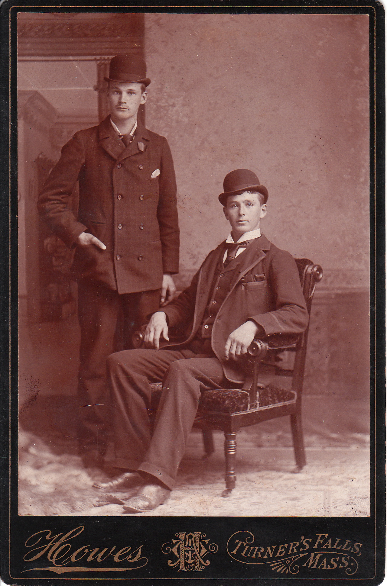 HOWES_0006Two well dressed young men wearing derby hats are captured in this portrait by the Howes studio in Turner’s Falls, Massachusetts. The Historic Northampton Museum web site has an article about the photographer of this cabinet card as well as a collection of his studio photographs. Actually, the site focuses on the Howes brothers, Alvah (1853-1919), George (1861-1925), and Walter (1865-1945).The Howes brothers were all photographers and began their career as traveling photographers. They photographed people in front of their houses, in their schools, and in their work places. The brothers tours included trips within Massachusetts, and to Rhode Island, Connecticut, and Vermont. By 1888 Alvah had opened a portrait studio in Turner’s Falls which operated until 1904 and produced the above cabinet card.  McFarland and Newman (1981) wrote a book about the lives and works of the Howes siblings. The book is titled “New England Reflections 1882-1907: Photography by the Howes Brothers”.