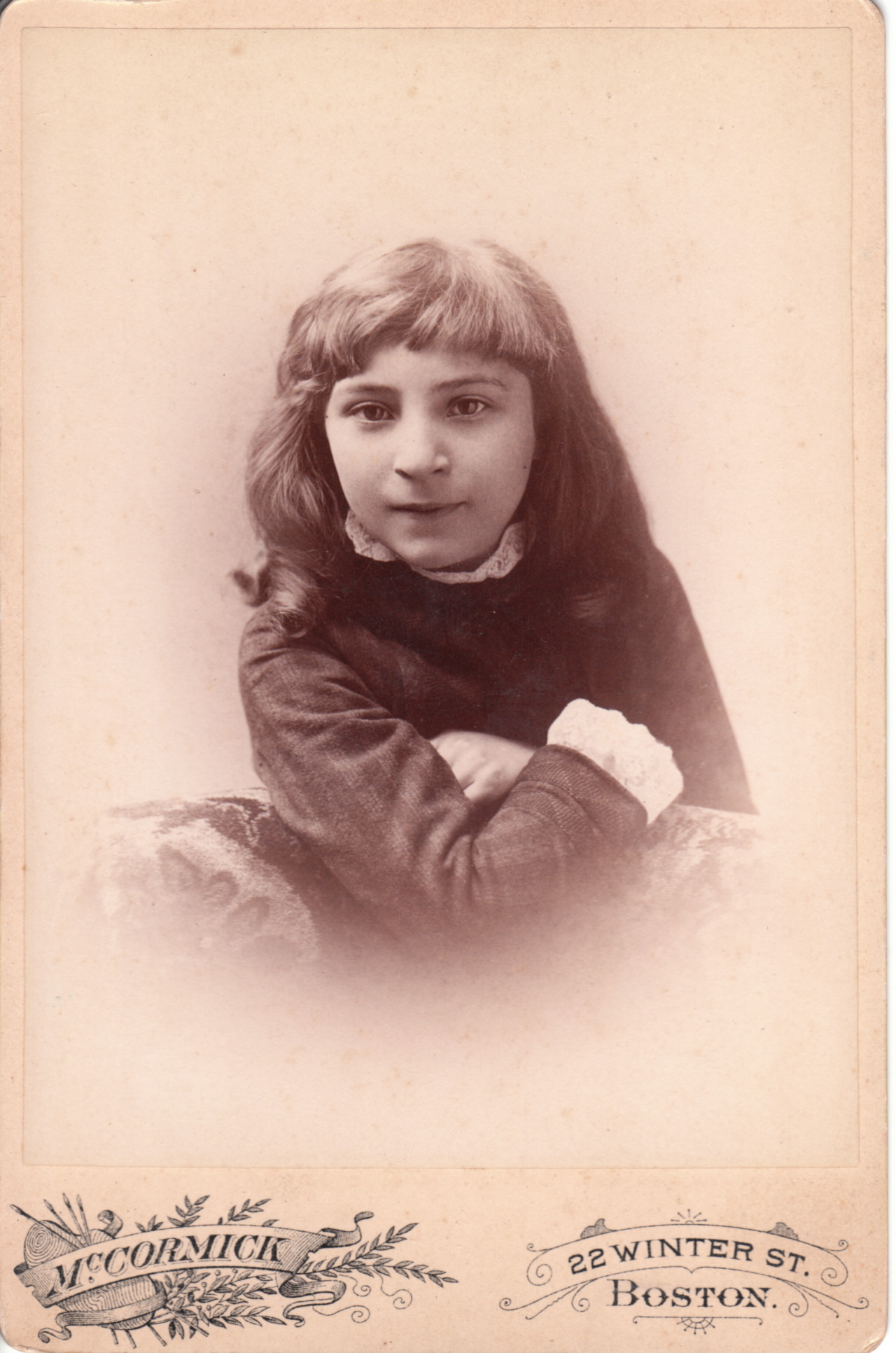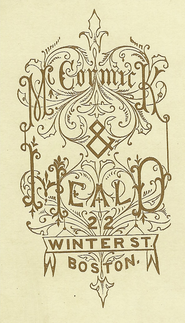 I do not think it is an exaggeration to state that the young woman seen in this cabinet card portrait, is exquisitely beautiful. She is well dressed and well coiffed. She has lace at her collar and at the bottom of her sleeves. Her hair was meticulously prepared for this portrait. She is wearing star earrings and a ring. She is holding a folded fan decorated with feathers. John L. McCormick and his partner Sumner B. Heald (1835-1900) operated the Boston studio that produced this excellent portrait. Both McCormick and Heald are no strangers to the Cabinet Card Gallery. The two photographers have a number of photographs in the gallery that can be accessed by placing their last name in the site’s search box. Take a look at their work and learn a little bit more about McCormick and Heald. Interestingly, Heald supervised the portrait studio operated by famed Boston photographer, George K. Warren (1824-1884). Warren also has a large presence in the Cabinet Card Gallery. Heald oversaw the celebrity and theatrical portraits produced by the Warren Studio. SOLD