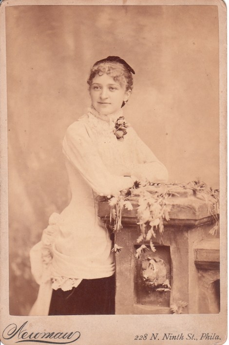 The pretty woman in this cabinet card photograph certainly knew how to dress fashionably. To accentuate her beauty her hair is carefully styled and she is wearing jewelry. She has a solemn expression as she intensely stares at the photographer. The photographer of this wonderful portrait was A. Newman of Philadelphia, Pennsylvania. To learn more about him and to view more of his photographs, click on the category “Photographer: Newman”. SOLD
