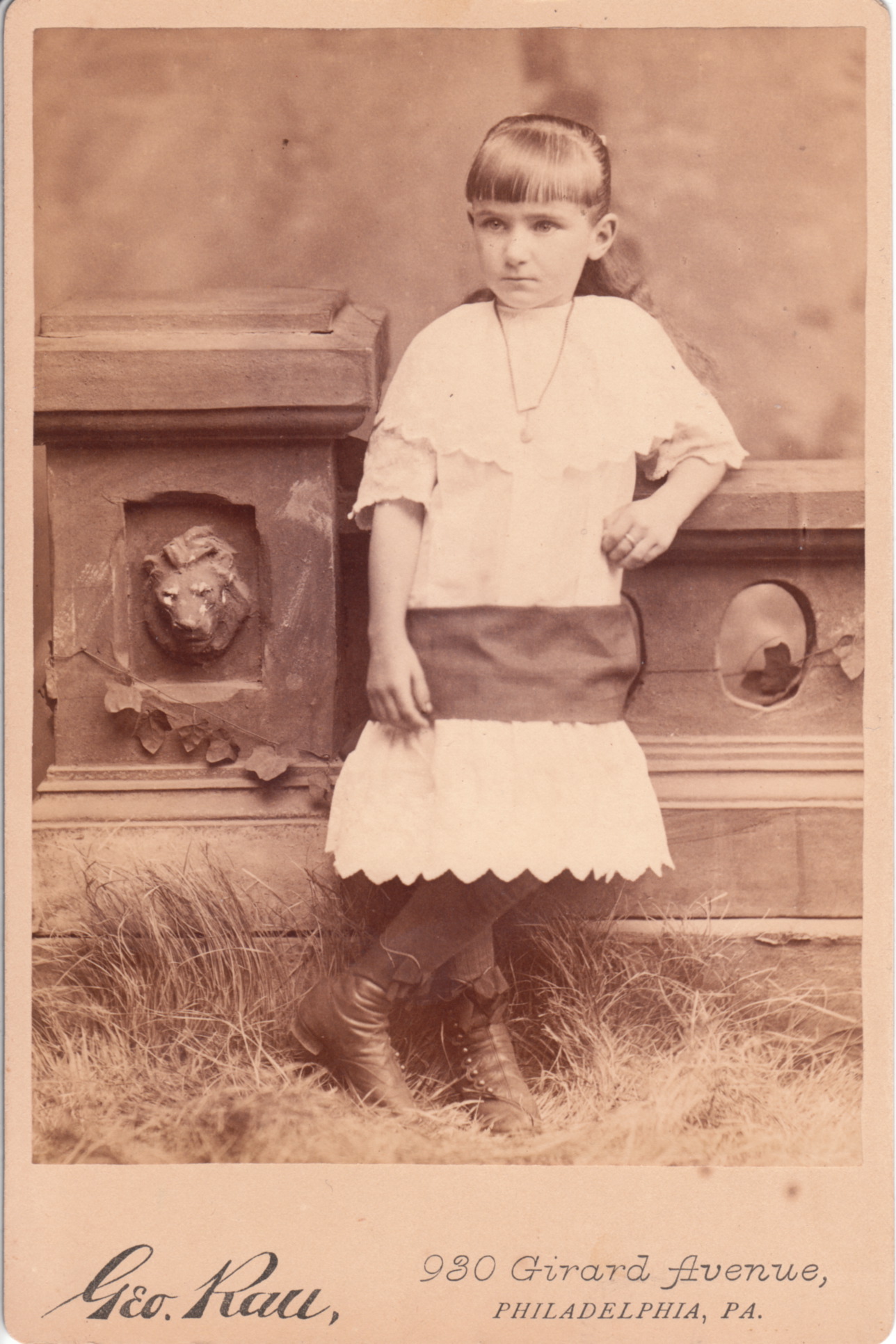 A young girl poses for this cabinet card photographed by George Rau of Philadelphia, Pennsylvania. She appears to be unenthusiastic about posing for this photograph. Note the sculpted lion head on the wall. The photographer, George Rau, was part of a well known family involved in early photography. Members of his family were active in the areas of lantern slides and stereographs. Research found much written about these family members but little about underachieving George. However, he was a contributor to a book called Photographic Mosaic (1884) in which he wrote a section on “Gelatine Emulsion Plates”.