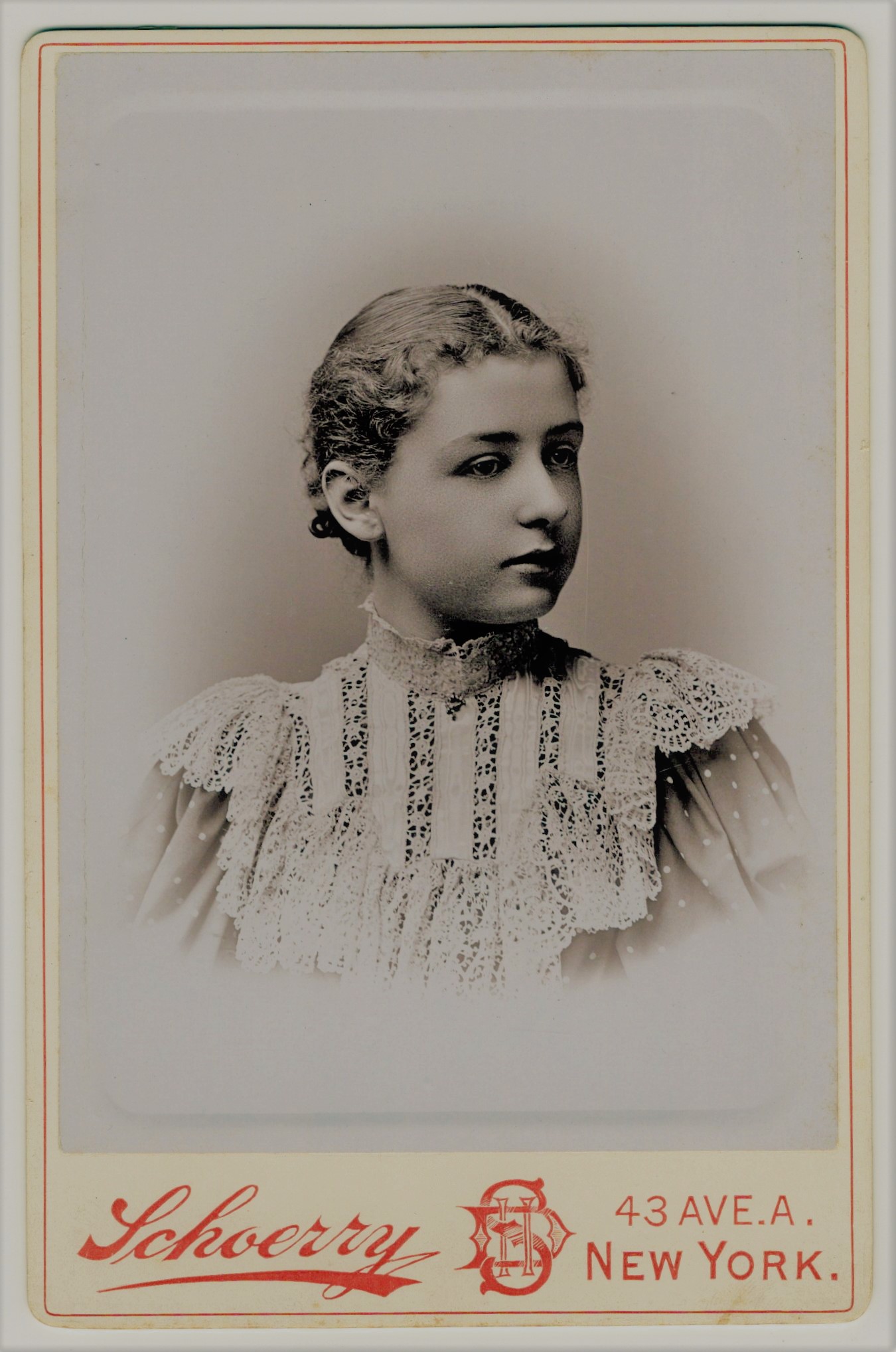 This Cabinet Card captures the image of a very attractive young woman posing in a staged outdoor setting. She is quite stylish and poised. The photographer was Henry D. Schoerry of New York City. Schoerry was born in Germany in 1854 and emigrated to America in 1870. He began working as a photographer in the 1880’s.