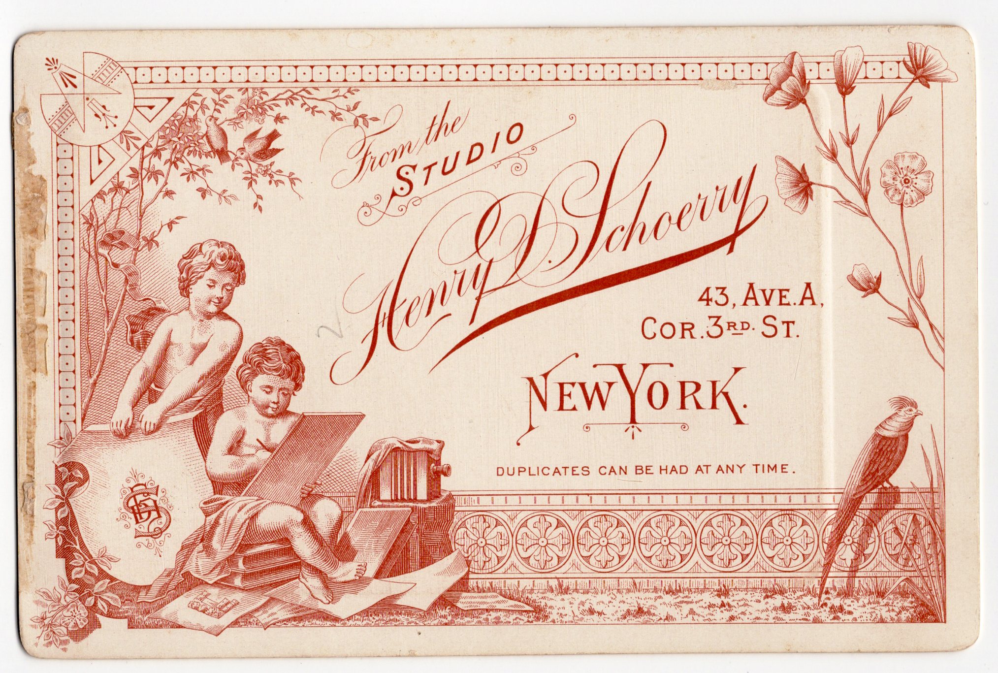 A well dressed and pretty young teenage girl poses for her portrait at the studio of Henry D. Schoerry in New York City, New York. The girl is wearing a lacey dress with a high collar. The photographer posed the teen in a manner in which he could take a partial profile photograph. Henry Schoerry was born in Germany in 1854 and emigrated to America in 1870. He began his career as a photographer in the 1880’s. This cabinet card portrait has a lovely backstamp. Note that this postcard has a bas relief feature and that accounts for any “outlines” you see on the image or the reverse of the card. This photograph is in very good condition (see scans).