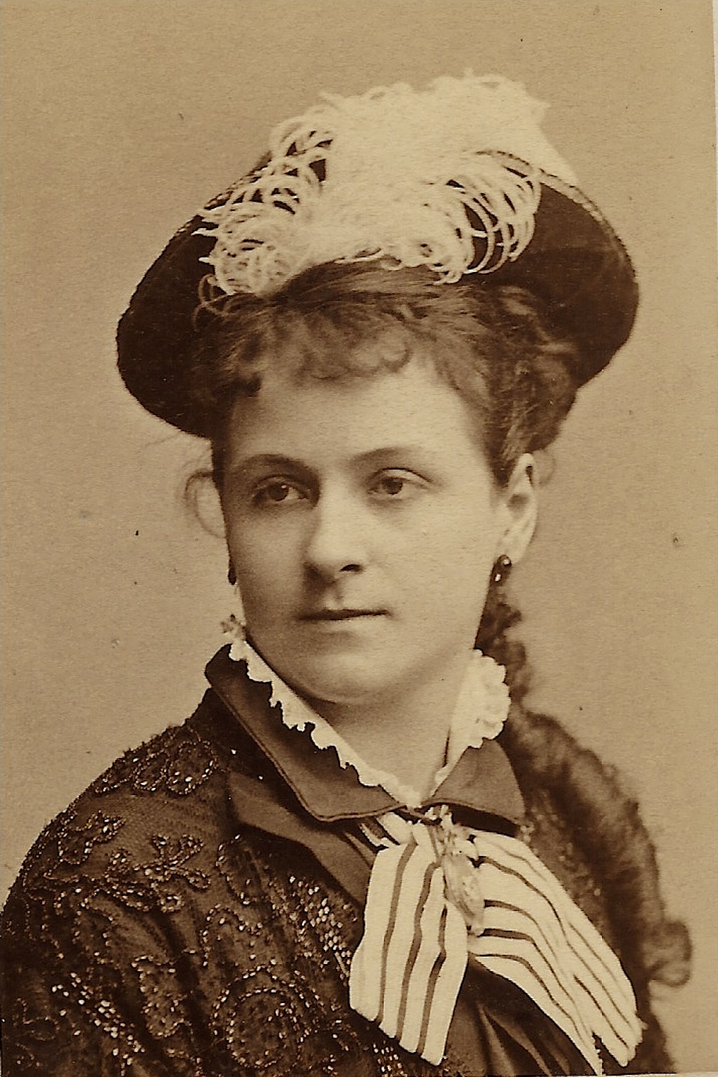 A pretty woman poses for her portrait in the studio of Dr Szekely in Vienna, Austria. The woman has an unusual hair style. Her hair seems to be straight on top of her head and she has beautiful curls on the side. The reverse of the photograph identifies the subject as Austrian theater actress Josephine Wessely (1860-1887). Wessely was born in Vienna and the daughter of a shoemaker. She began drama school at age fourteen and had her debut in “Intrigue and Love” in 1876 at the Leipzig City Theater. In 1879 she became a member of the Burgtheater ensemble. She was known for playing juvenile tragic roles and gained recognition for playing Gretchen in Goethe’s “Faust”. Wessely died at 27 years of age. The cause of her death is suspected to be leukemia. Printing on the reverse of the card reveals that Dr Szekely won medals for his photography in exhibitions in Vienna (1873) and Paris (1878). To learn more about Dr Szekely and to view more of his photographs, click on the category “Photographer: Szekely”.