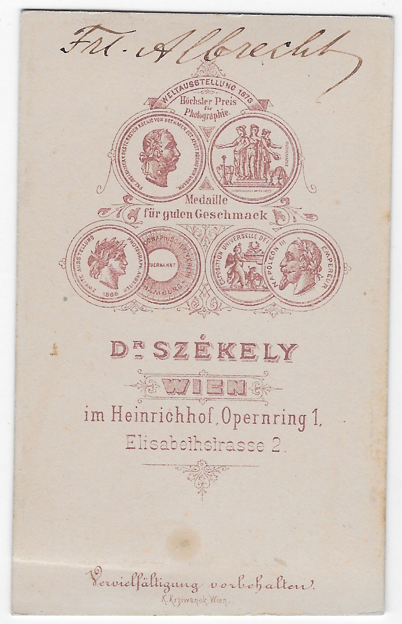 This carte de visite portrait features Austria-Hungarian theater actress Hermine Albrecht (1856-1929). She studied acting with German actor, Karl Wilhelm Meixner and made her debut in 1875. In that year she signed with the Vienna City Theater where she worked until 1884. In 1887 she joined the ensemble of Burgtheater ensemble and in 1890 she was appointed a court actress. She left the theater in 1893 to join private life. She was married to Count Tamas Nyary de Bedegh (1838-1902). Her sister was also an actress (Charlotte Albrecht).The photographer of this image is Dr Szekely. He is cited multiple times in the photographic journals of his time for his photography research. Dr Szekely operated a studio in Vienna, Austria. As of this writing, the Cabinet Card Gallery has two other photos by Szekely. One of these images is of Austrian theater actress Josephine Wessely (1860-1887). To view the other photographs by Szekely, place his name in the blog’s search box.This photograph was taken during or after 1873. This is known because of the the award medallions seen on the reverse of the photograph is dated 1873, (SOLD)
