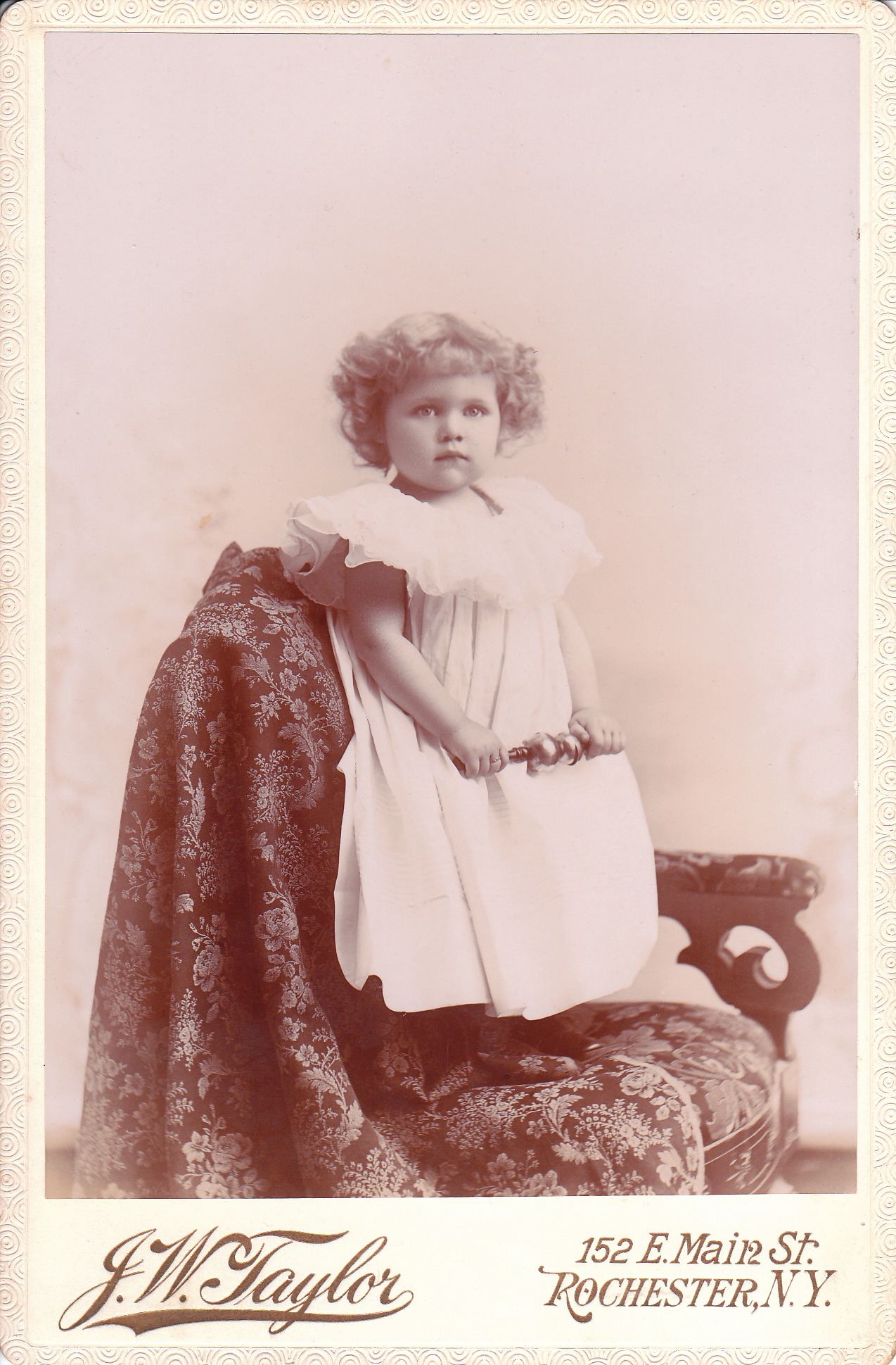 The little girl pictured in this cabinet card portrait is none too happy to be at J. W. Taylor’s studio in Rochester, New York. In fact, she looks bewildered about the entire experience. She is wearing a pretty dress with a bow tied in the front. To learn more about the photographer and to view more of his photographs, click on the category “Photographer: Taylor JW”.