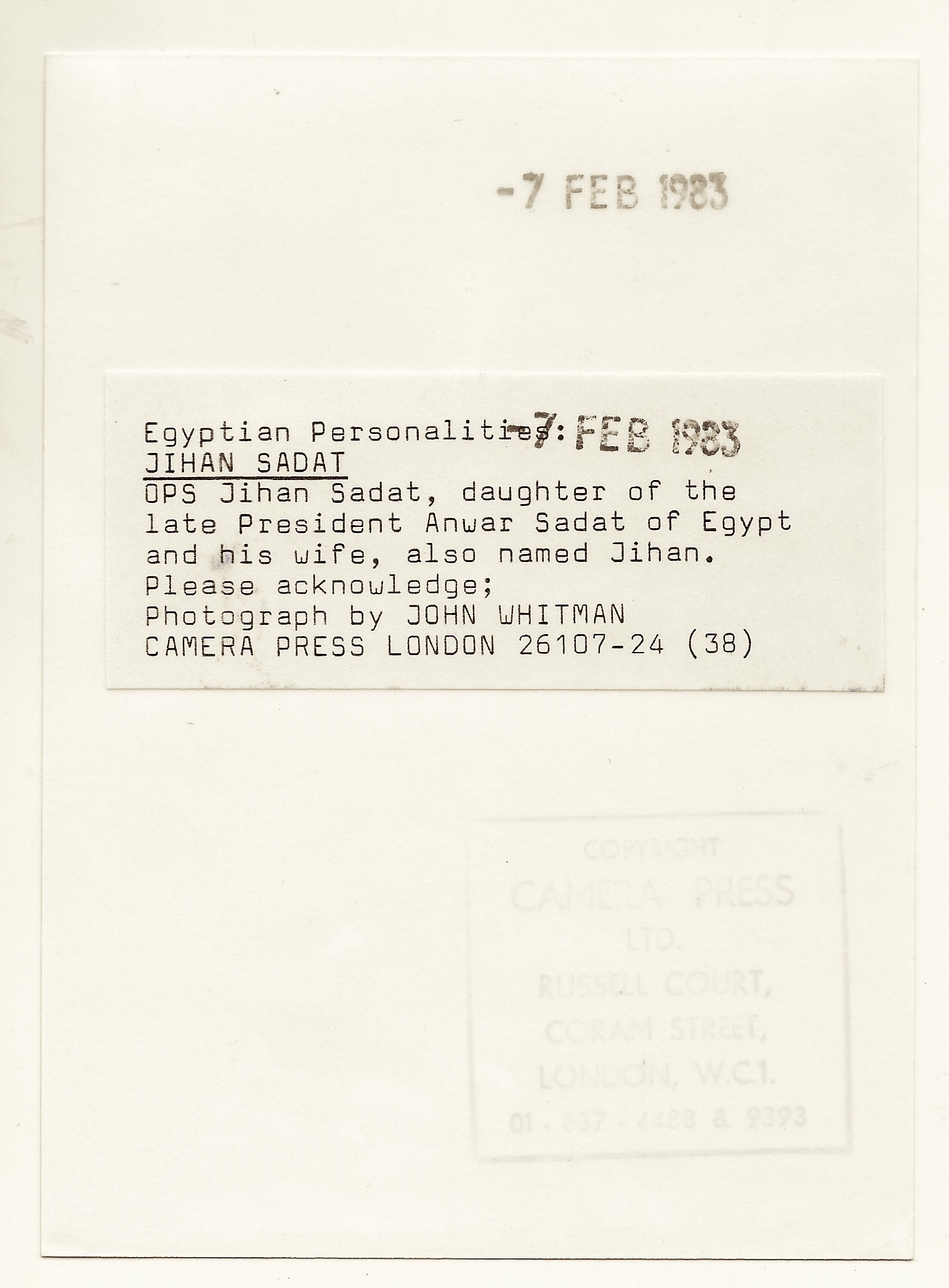 This press photo features Jihan (Jehan) Sadat. She is the daughter of the late Egyptian President, Anwar Sadat (1918-1981). He was the third President of Egypt and served from 1970 to 1981. He was assassinated while in office. He negotiated a peace treaty with Israel’s Menachem Begin and the two shared the Nobel Peace prize. This photograph was taken by John Whitman of Camera Press, located in London, England. It was taken in 1983.  SOLD