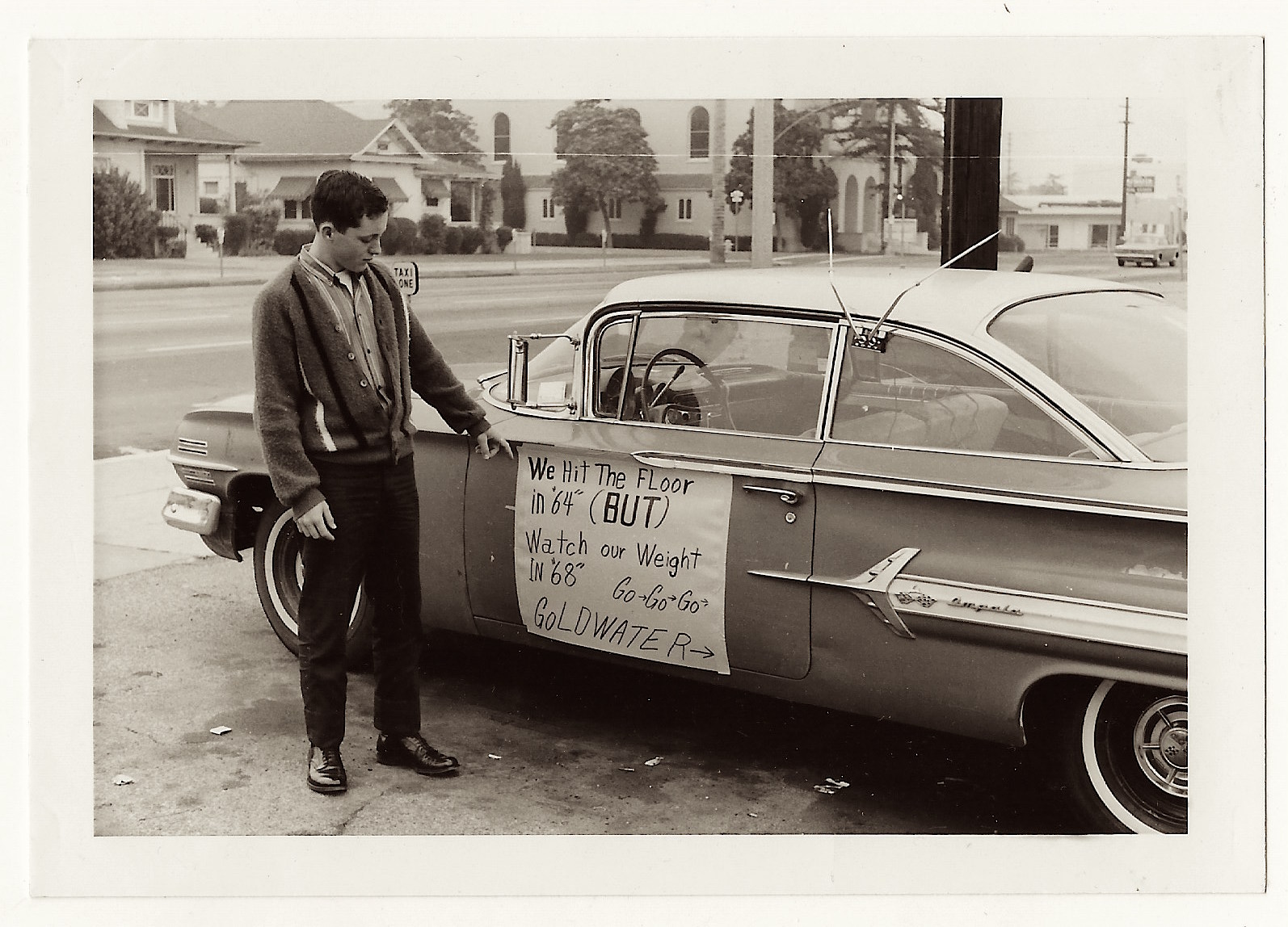 This snapshot photograph is an excellent piece of American social history. The image shows a young man pointing to a political poster affixed to the side of a 1959, or 1960 Chevy Impala. The sign is supporting the 1968 US Senate campaign of Barry Goldwater (1909-1988). Goldwater was a conservative republican from Arizona. The sign states that Goldwater “hit the floor in ’64”. Hitting the floor is a reference to the fact that Goldwater lost the Presidential election to Lyndon B Johnson in 1964. Johnson won a landslide victory. Goldwater only won six states. The sign maker wrote “Watch our weight in ’68”, referring to Goldwater’s Senate race that year. The sign maker was predicting victory and victory is exactly what occurred. Note the car’s radio antenna. Also take note of the “Taxi” sign behind the boys left shoulder. It is interesting to note the John McCain succeeded Goldwater in the US Senate. This photograph is a perfect illustration of life in the late 1960’s. The Chevy and the boy’s attire (love the cardigan sweater), take me back to a simpler time. (SOLD)