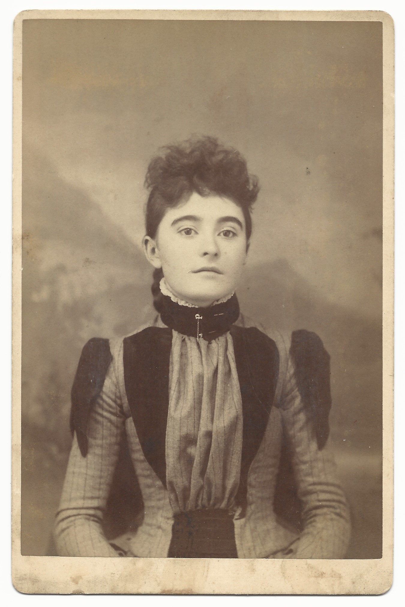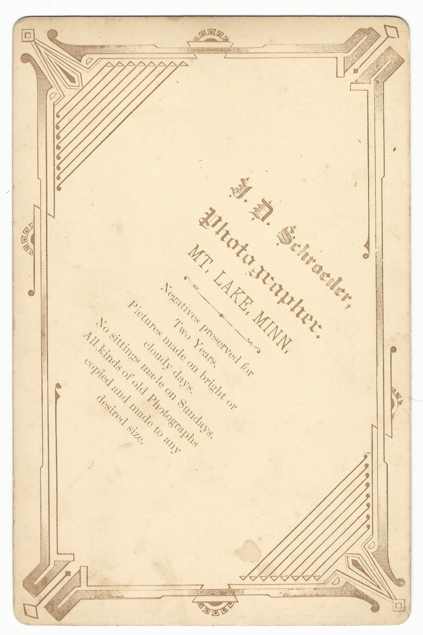 This cabinet card portrait features a lovely sweet young woman with beautiful dark eyes. She is wearing what I consider to be an unusual dress. Note the black pennant shaped pieces of fabric attached to her dress. The photographer of this image is Jacob D. Schroeder of Mt. Lake, Minnesota. Schroeder was born in Russia in 1858 and arrived in Minnesota in 1873. He was a photographer for ten years and then became a manager of a telephone company in Mountain Lake. In 1903, he became a representative in the legislature. Other government experience included holding office as Justice of the Peace, School Board Secretary, and Postmaster. SOLD