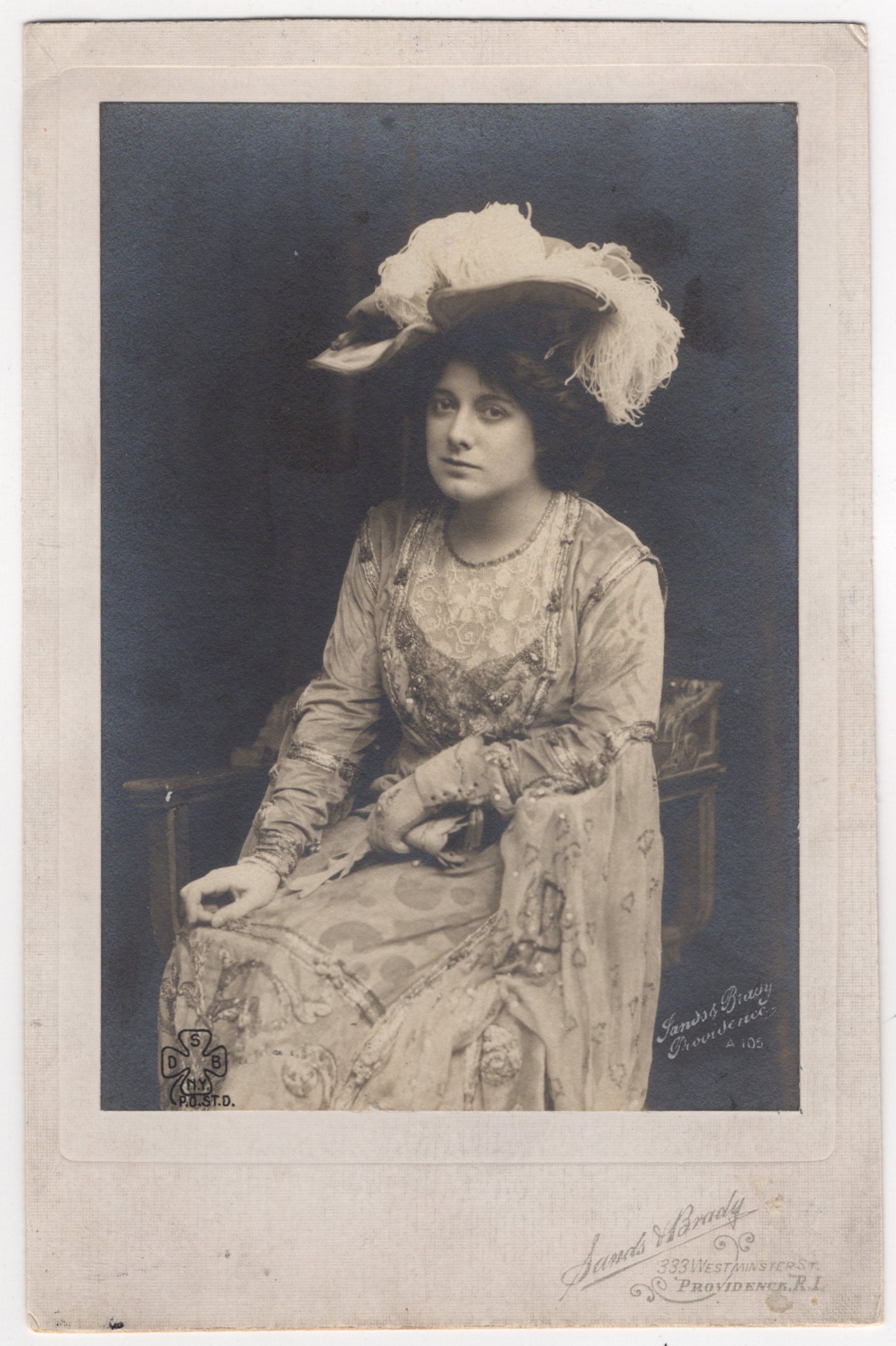 Vintage Photograph 16 shows a seated pretty young woman—Julia Marlowe—posing in a studio setting. This photograph is printed on a thin paper stock and then mounted to a heavier card. This was a common production method, and the piece appears exactly as manufactured. I have seen this same image as a postcard. Marlowe wears an elaborate Edwardian dress with ornate embroidery, beadwork, and lace detailing. Her gown has layered textures and patterns, and she rests one hand on her lap while the other lightly touches the chair. She wears a large, dramatic hat trimmed with tall, soft plumes that sweep upward and to the side. Her expression is calm and direct, looking slightly toward the camera with a composed, almost introspective gaze. The background is a simple dark studio backdrop that highlights her figure and outfit. The photographer is identified as the Sands & Brady studio in Providence, Rhode Island. In the lower left corner of the image is a distinct publisher’s mark: a four-leaf-clover-shaped logo with letters in each quadrant. The clover has three letters in it, S., D., and P.. The fourth quadrant indicates that the publisher was located in New York. (SOLD)