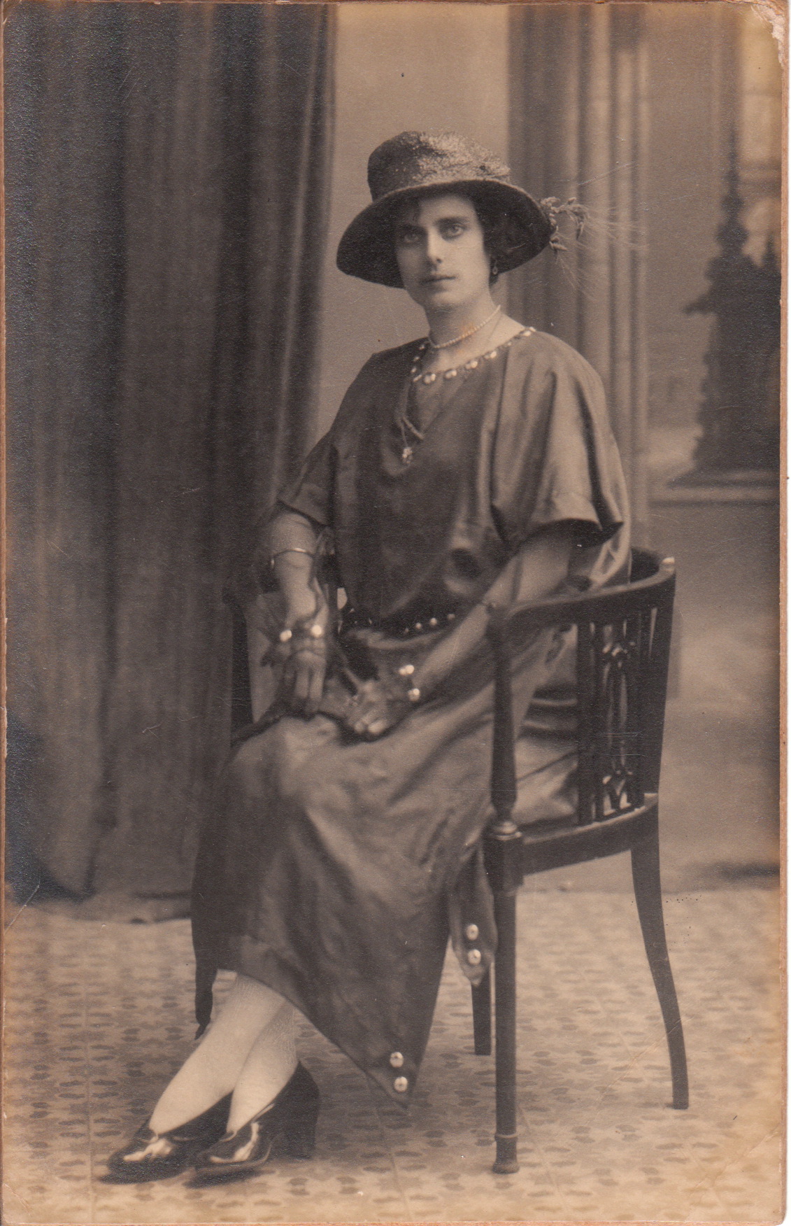 This image features a well dressed woman posing for her portrait at the Amadeo studio in Palma de Mallorca, Spain. Amadeo’s gallery was located at 19 Calle San Nicolas. The subject of this photograph is unidentified. She is wearing jewelry and a nice hat. Her arms seem to be covered by translucent lace material that resemble stockings, but worn on the arms. It is clear that I need some major assistance from the cabinet card gallery research department (comprised of the site’s visitors) in order to explain the woman’s undersleeves. It is unknown whether the woman in this photograph was a visitor or resident of Palma. Palma de Mallorca is a major city and capital of the province of the Balearic Islands in Spain.