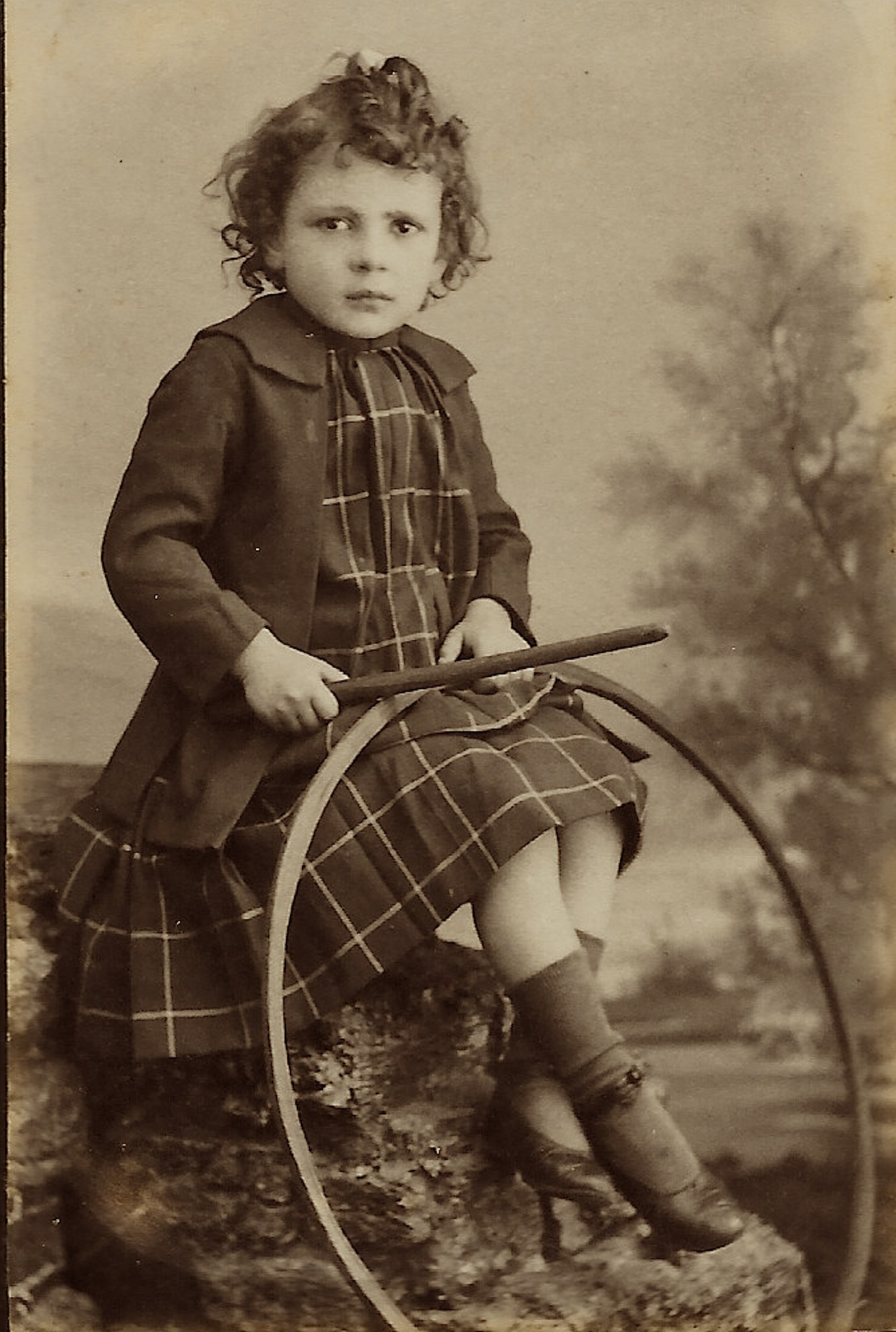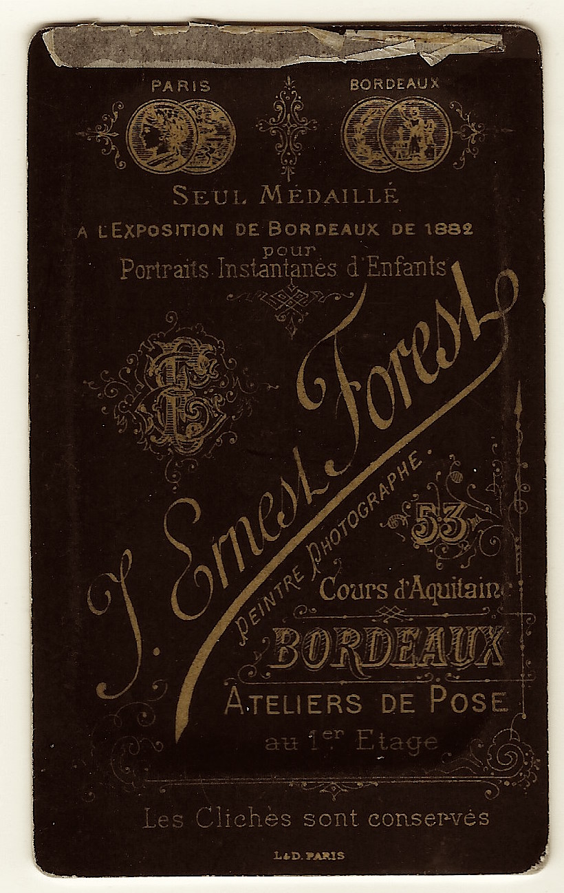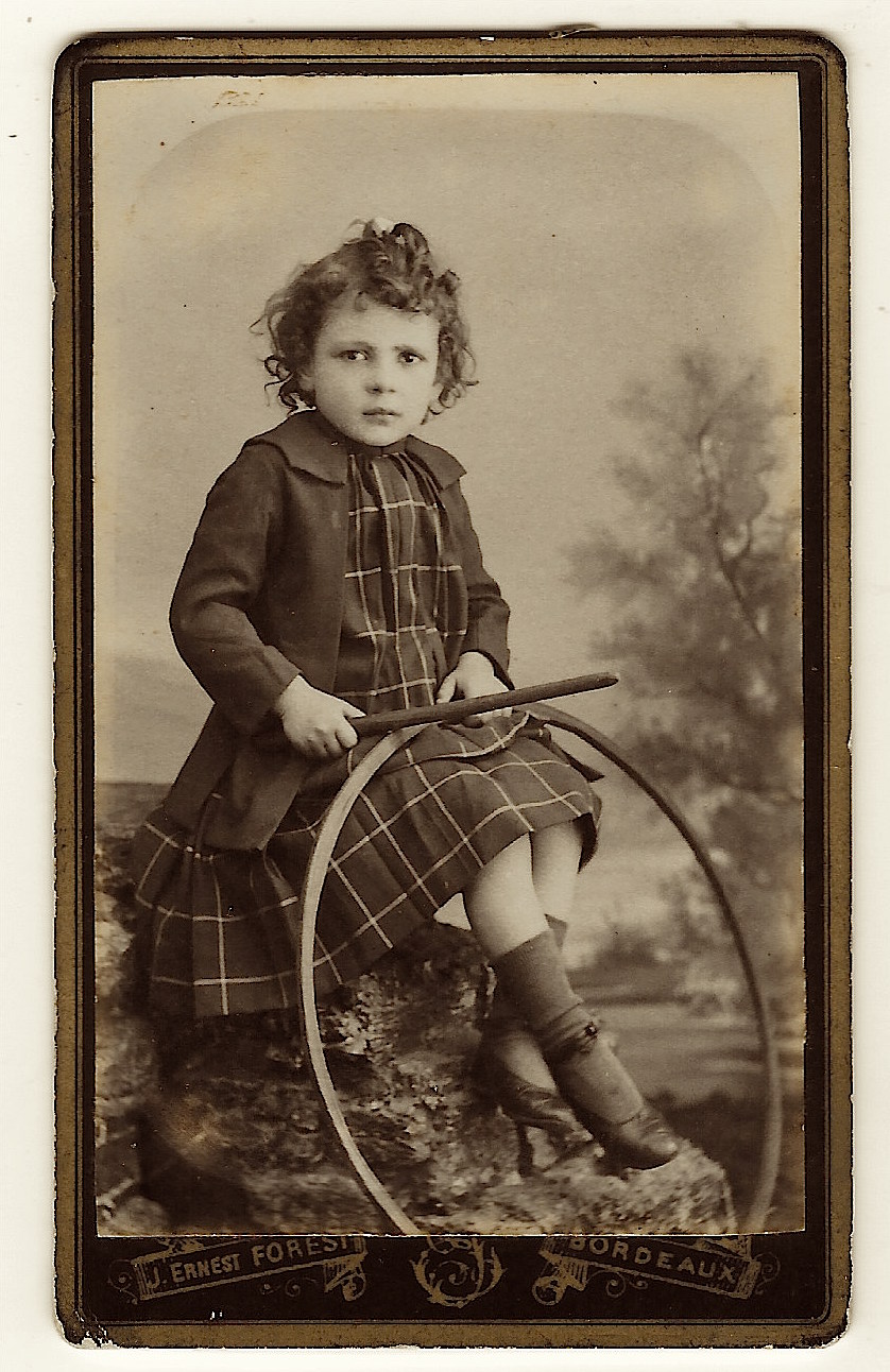 This carte de visite portrait features a young girl wearing a plaid dress and holding a hoop and stick toy. The photographer of this photo is J. Ernest Forest and he operated a studio in Bordeaux, France. Advertising on the reverse of the cdv indicates that the studio won prizes at exhibitions in Bordeaux and Paris.This photograph is in good condition (see scans). A look at the top of the backside of the cdv reveals that this photo is likely a former resident of a photo album or picture frame.