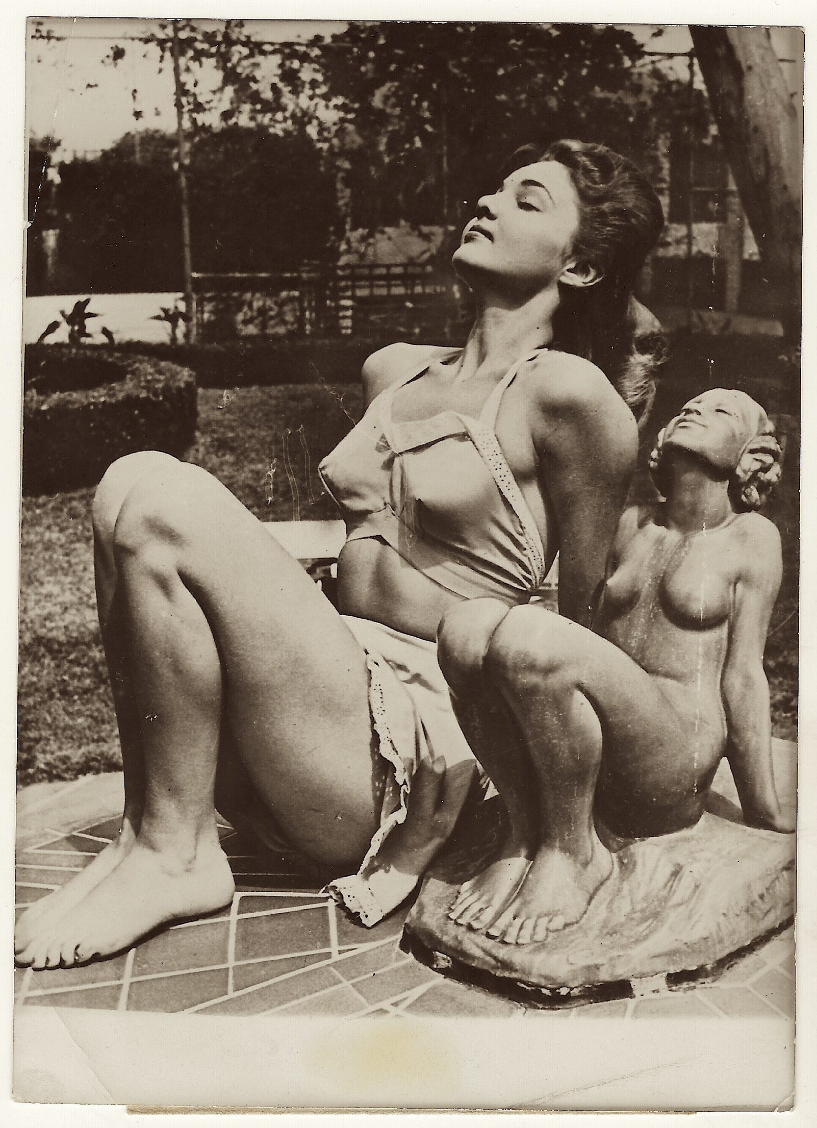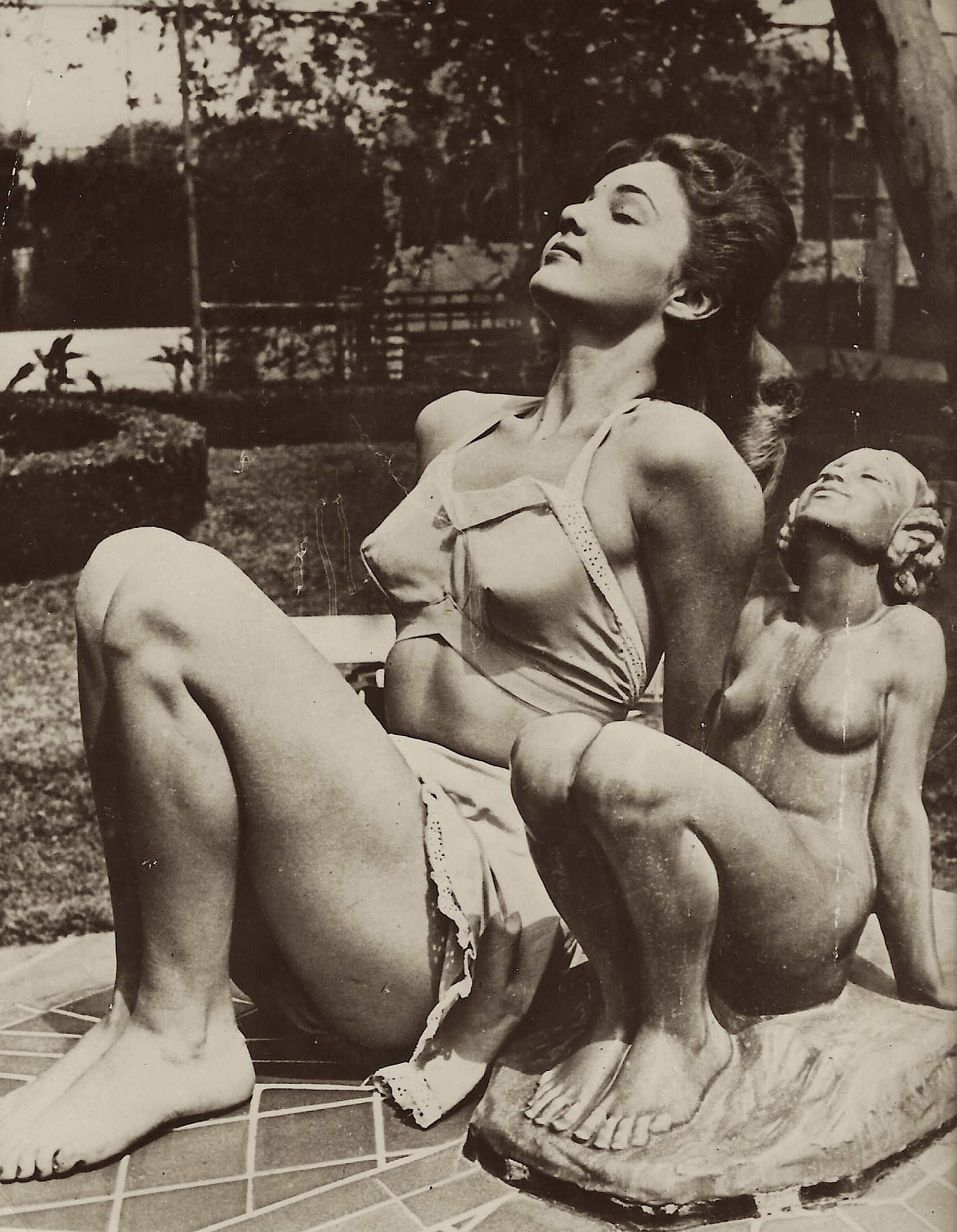 The photographer of this press photo must have been in a playful and creative mood at the time that this photograph was taken. The image features a statue and its model, side by side, in identical poses. The caption of the photograph, affixed to the reverse, indicates that the model is “beautiful” Hollywood star, Toni Seven. It also states that she was the fiance of Senator Warren G Magnuson of Washington state. The photograph was taken in 1949. Toni Seven (1922-1991) was born as June Elizabeth Millarde. Her mother was noted stage and silent film actress, June Caprice. Caprice also worked as a model. Toni’s father, Harry F Millarde, was a film director. Toni’s father died when she was just 8 years old. She was orphaned at age 13 when her mother died. Her grandparents took on the responsibility of raising young Toni. She was raised in the town of Great Neck, located on Long Island in New York state. An article in Time Magazine (1949) indicates that she was financially secure. It was reported that she was a heiress to a fortune worth 3 million dollars. It appears that Toni Seven was genetically loaded to become a performer. As Toni Seven, she was a popular American cover girl and actress, In the early 1940’s she played minor roles in three films. One of these films was the well known “Yankee Doodle Dandy” (1942). She later appeared in two more films. When World War II began, she became a volunteer at the “Hollywood Canteen”, The canteen offered food, dancing and entertainment to servicemen, many of whom were preparing to go overseas. Everything at the canteen was free for uniformed servicemen and servicewomen, She was named pin-up of the year by US soldiers in the European theater in 1945. In 1944, she changed her name to Toni Seven. She thought it would be fun to sign her name “Toni 7”. When the first pin-up exhibition in the United States was held in 1944, Toni Seven was featured along with many other beautiful models, including Jane Russell. In 1946, Seven reclaimed her original name. In 1949, newspapers ran articles asserting that Toni was romantically involved with Washington US Senator, Warren Magnuson. Although the caption of this press photo states that she and Magnuson were engaged, the pair never married. However, the couple dated on and off between 1948 and 1953. Looking at Toni Seven’s biographical data, it is clear that her acting career was unremarkable. Toni appeared in only five films. Stellarstar writes in the blog “Those Obscure Objects of Desire” that “Toni Sevin is proof that a girl who lands in Hollywood, has money to burn, a great press agent and more than enough beauty, can still end up a complete unknown”. Toni was successful in other areas of her life. She was a great horsewoman, and also excelled at swimming and tennis. She despised gossip but created some when she dated Errol Flynn and other celebrities. This press photo belonged to the Intercontinental agency, located in Paris, France. An additional photograph of Miss Seven can be found below. SOLD