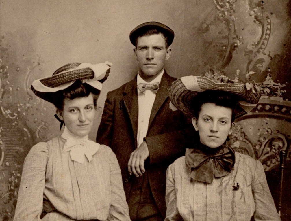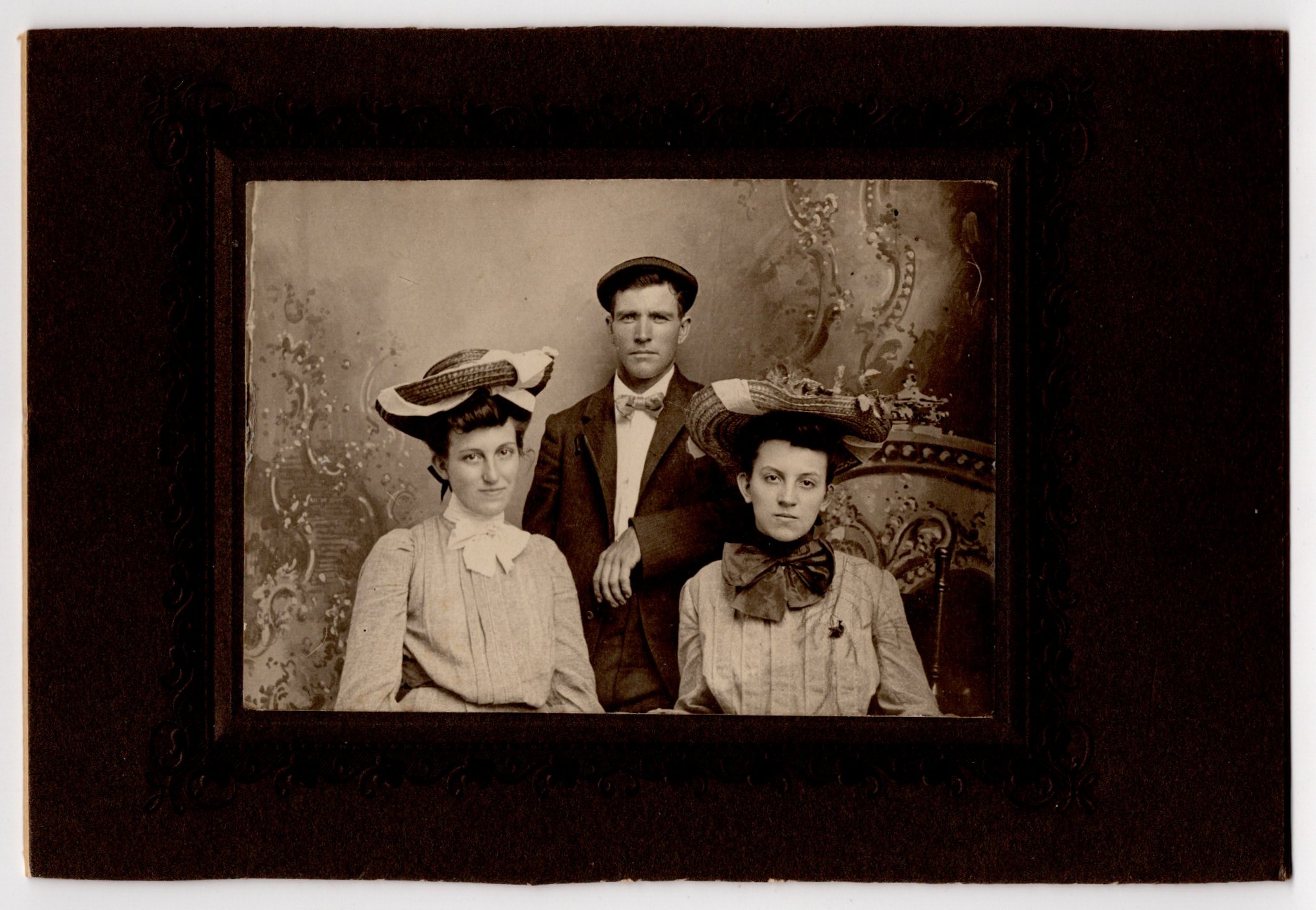This evocative early 20th-century photographic portrait depicts three young adults posed in a studio setting, arranged in a classic triangular composition that emphasizes both formality and subtle interpersonal dynamics. The photograph measures 6 ¼ x 4 ¼ inches, a size commonly associated with privately commissioned portraits from the late 1890s to early 1900s, just before the widespread dominance of postcards. The man stands at center, slightly behind the two seated women, resting one arm casually across the back of a chair. He wears a dark suit jacket, a crisp white shirt, and a neatly tied bow tie, topped with a flat cap. His expression is steady and unsmiling, projecting quiet confidence and composure rather than overt warmth—typical of male portraiture of this era, where restraint was often equated with dignity. The two women flanking him are dressed in fashionably structured blouses with high collars, each wearing an elaborate hat that reflects the period’s emphasis on millinery as a marker of style and social standing. The woman on the right appears more reserved, her face calm and serious, eyes directed forward with little visible emotion. The woman on the left, however, is especially compelling. Her expression carries a subtle complexity—a faint, knowing half-smile combined with alert, engaged eyes. Rather than the blank neutrality seen in many studio portraits, her gaze feels self-aware, even slightly amused, as if she is conscious of the moment and perhaps skeptical of its formality. This small emotional deviation gives the photograph much of its charm and individuality. The studio backdrop features a painted decorative scene with ornate scrollwork, lending depth and visual interest without overpowering the sitters. The photograph itself is in very good antique condition, with strong contrast and excellent clarity in facial features and clothing details. No creases, tears, or losses are evident. Overall, this piece displays well and retains significant visual and historical appeal.