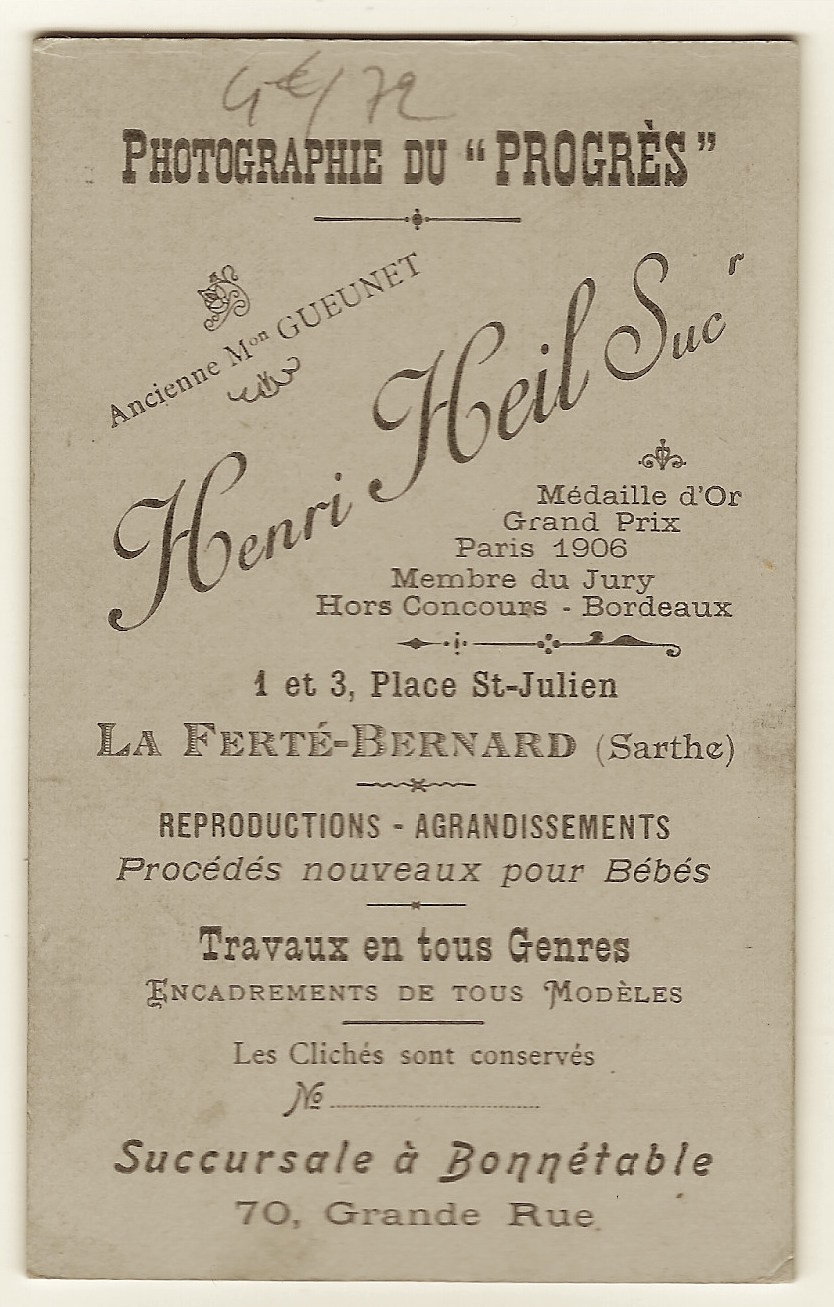 This original carte de visite photograph features a cute little girl sitting on a fur covered chair. Judging by the expression on her face, she is not sure how to interpret the situation she finds herself in. The photographer of this cdv image is Henri Heil. He operated a studio in La Ferte-Bernard, France. This carte de visite is slightly bowed but in overall good condition (see scans).
