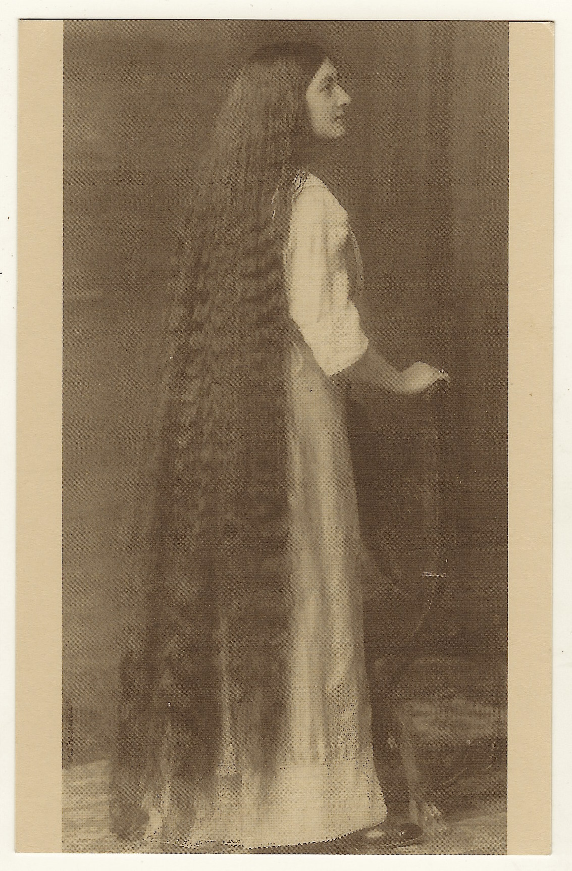 This vintage postcard features a young woman with beautiful long hair. Her hair nearly reaches the floor. (SOLD)