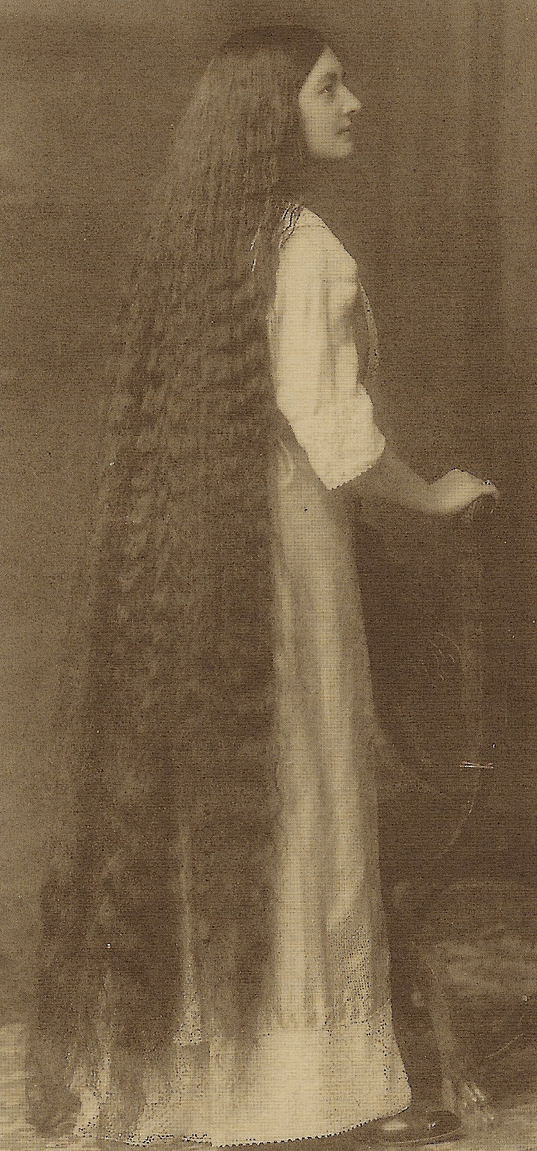 This vintage postcard features a young woman with beautiful long hair. Her hair nearly reaches the floor. (SOLD)