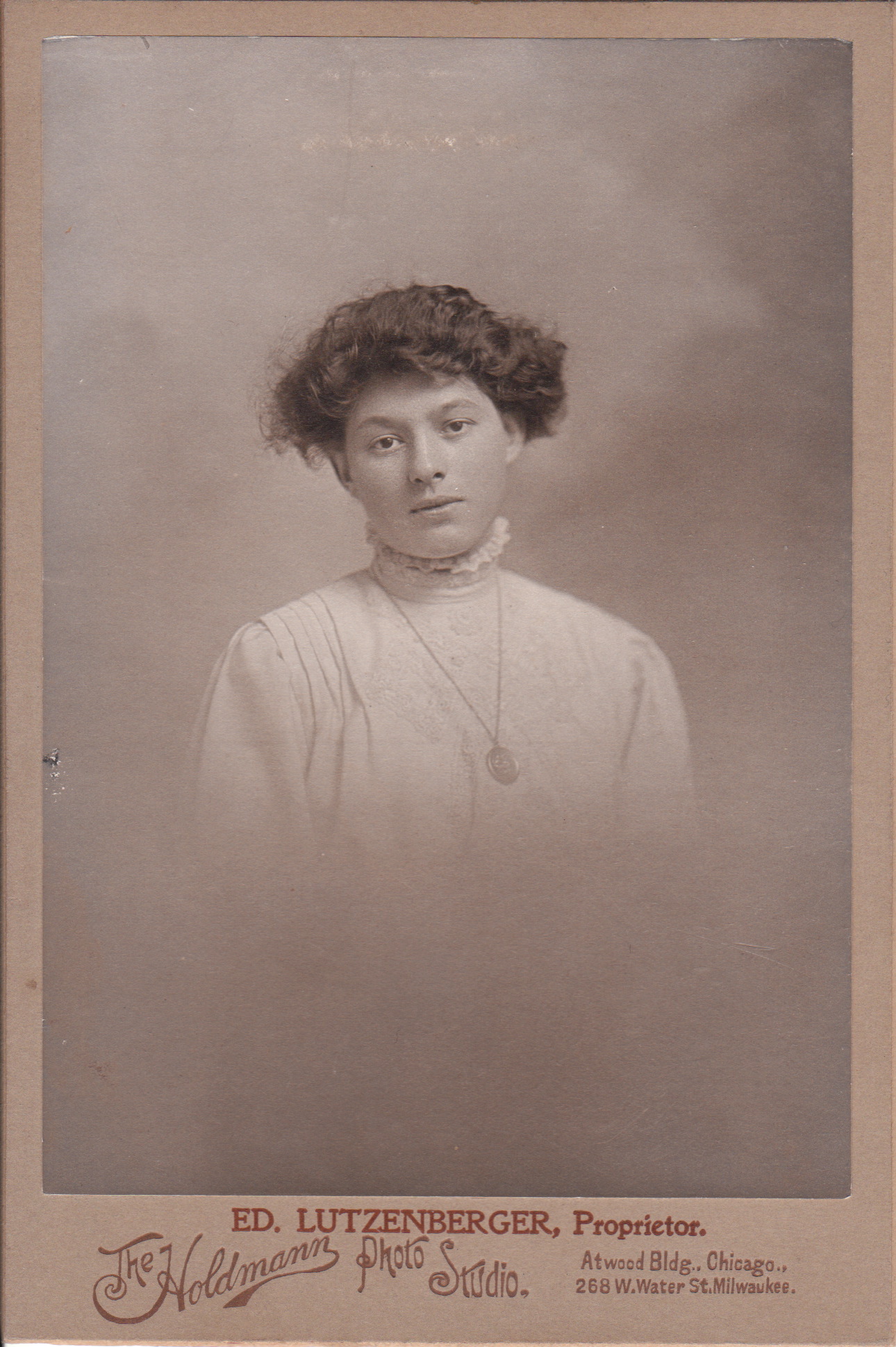 This cabinet card features a pretty woman with frizzy hair. She is wearing a dress with a high collar and a long necklace. The photographer did an excellent job of capturing the woman’s facial expressiveness. The Holdmann Photo Studio produced this image. The propietor of the studio was Edward Lutzenberger and the studio had a location in both Chicago, Illinois and Milwaukee, Wisconsin. Printing on the reverse of the photograph indicates that this image came from the Milwaukee studio. Also on the reverse of the photograph is printed guarantee and request for feedback that could be seen on any internet auction site. Lutzenberger guarantees that photographic portraits from his studio would not fade. The statement that sounds like it could be from modern day times is “If you are pleased tell others, if not tell us.” Lutzenberger probably purchased his studio from Charles Holdmann (1851-?). Holdmann’s studio was located at 224 Grand Avenue in Milwaukee. The 1900 US census reveals that Edward Lutzenberger lived at his mother-in-law’s house with his wife Anna Drager Lutzenberger and their one year-old daughter Norma. Lutzenberger and his wife married in 1897. Both Edward and Anna were born in Wisconsin. Edward was of German descent. He was employed as a photographer. The 1910 US census reports that Edward and his wife and daughter remained in Milwaukee and Edward was still working as a photographer. The 1920 census lists Edward and Anna as still living in Milwaukee with their, then 20 year old daughter Norma. There was a new addition to the household. Norma had a six year old son named Edward. It seems young Edward was born when Norma was around 14 years old. Norma was employed at the time of the census as a stenographer. The 1930 and 1940 census found Edward and Anna living in Milwaukee and Edward was working for the Railroad police. Milwaukee business directories list Edward as a photographer from 1894 through 1913. He certainly may have worked as a photographer in additional years but research could not document other years.