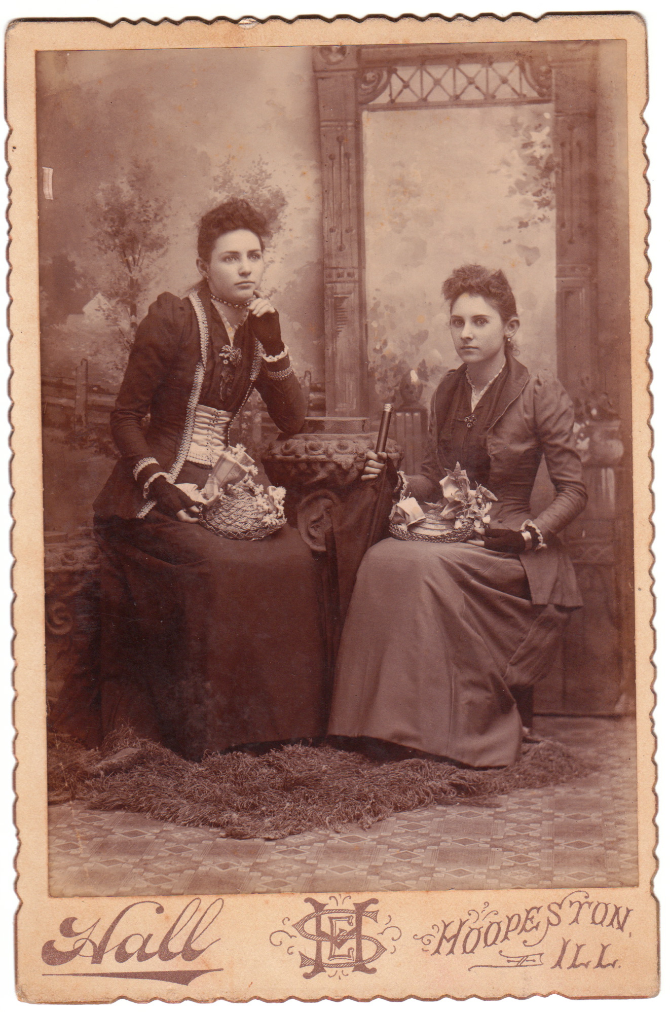 Two pretty young woman pose for their portrait in this scalloped cabinet card produced by the Hall studio in Hoopeston, Illinois. The women do not seem very enthusiastic about having their photograph taken. Each of the subjects have baskets of flowers on their laps and are wearing fingerless gloves. The woman seated on the right in the image is holding what appears to be an umbrella. Both of these ladies have very thin waists. They are probably wearing corsets. Perhaps those corsets are a little too tight and that would explain the pained expressions they display in the photograph. The photographer, Ervin S. Hall, appears in the 1880 US census. Hall was 25 years old and married (1877) to Violetta Hall (age 27). Hall’s parents were born in Maine but he and his wife were Illinois natives. The couple lived in Hoopeston and Hall worked as a photographer. The 1900 US census found Hall and his wife living in Grant, Illinois with their two children, Ellis (age 17) and Ethel (age 15). Ervin was still working as a photographer. The 1910 US census lists Hall and his wife living in Urbana, Illinois and Ervin still employed as a photographer. The 1920 US census reveals that the couple was living in Kissimmee, Florida and Ervin was working as a hardware salesman. The 1930 US census indicates that Ervin was retired and he and his wife remained in Kissimmee. Research uncovers the story of Hoopeston, Illinois. The town was created in 1871 and named for Thomas Hoopes who had offered his land to be the site of the crossing of two railroads. The business and manufacturing that developed in Hoopeston centered around agriculture. The Illinois Canning Company (1875) and the Hoppeston Canning Company (1878) were established there. Greer College (1890) was also established in Hoopeston.