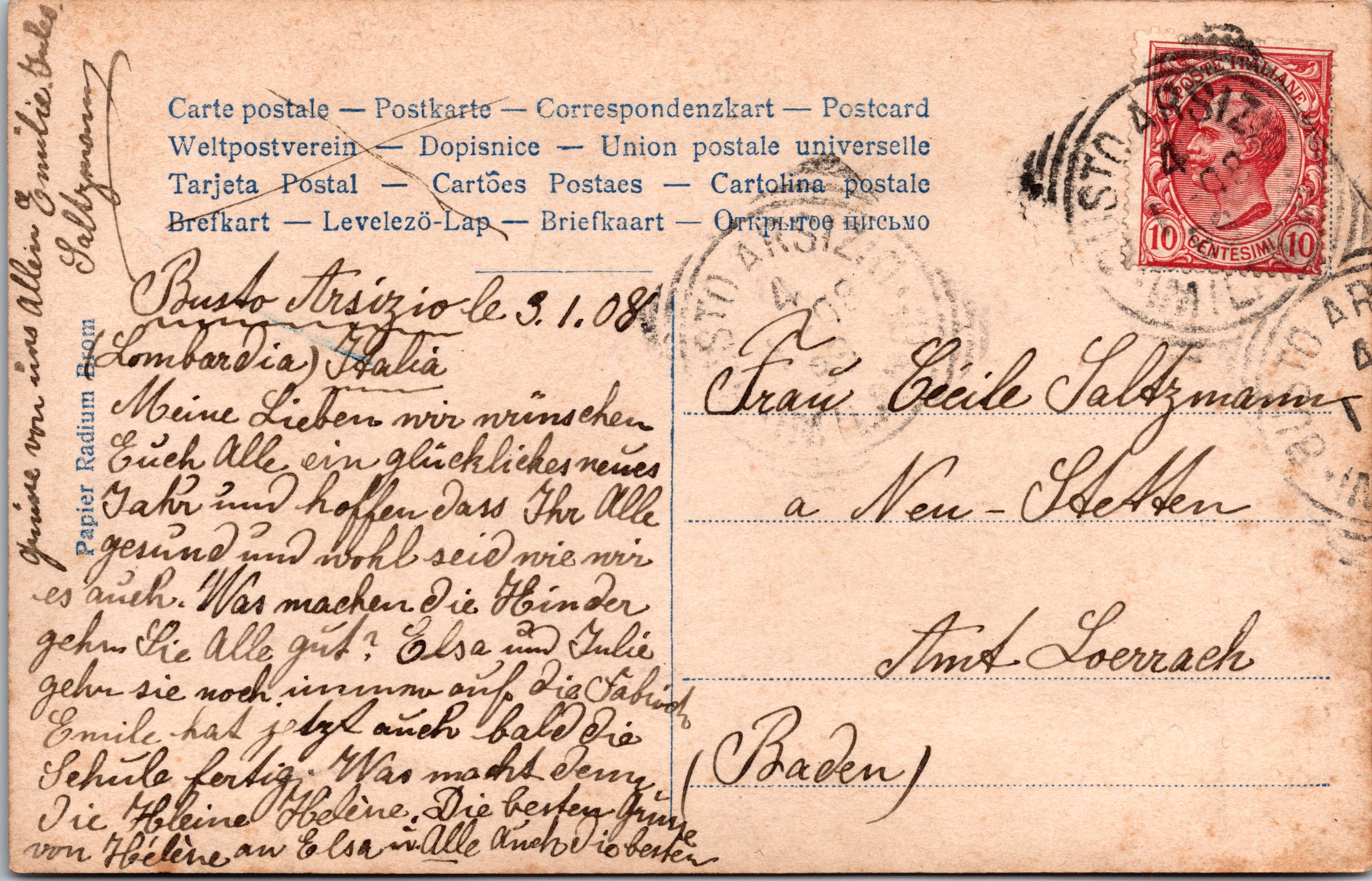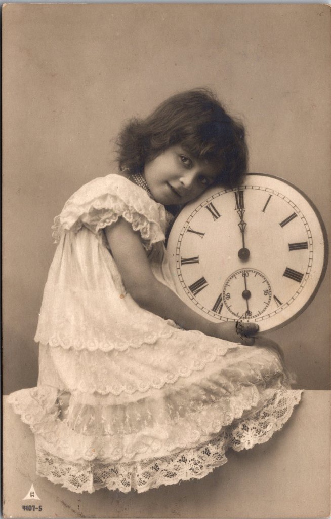 This vintage divided back real photo postcard features a sweet little girl hugging a large clock. The clock is striking midnight and this card may actually be a New Years card. The card was published by Photochemie as part of a series (No.4107-5). The firm was located in Berlin, Germany. The postcard has an Italian stamp and was postmarked in 1908.(SOLD)