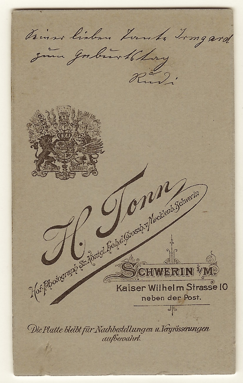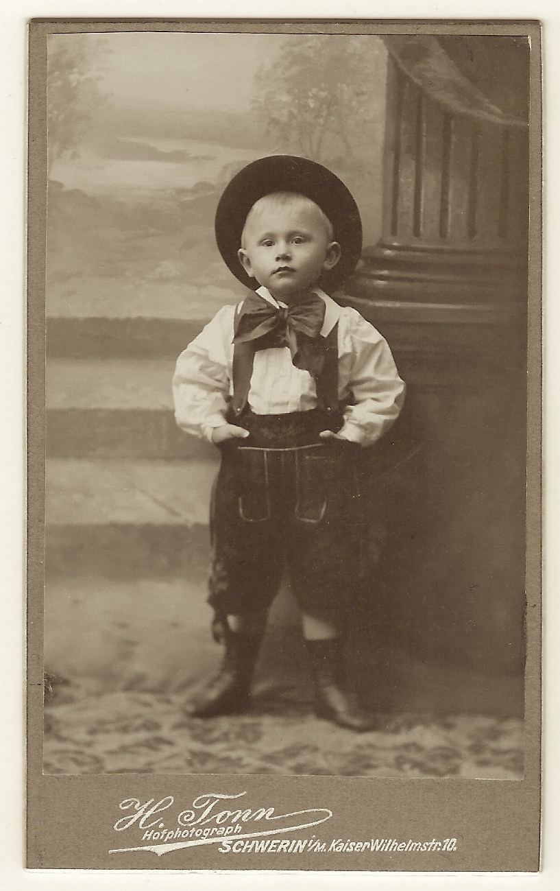 An adorable little boy poses for his portrait at the studio of H. Tonn in Schwerin, Germany. The young child appears quite poised and is so cute in his outfit which includes overalls (or are those straps..suspenders), bow tie, and wide rimmed hat. The cdv has an inscription on it’s reverse that I could not translate.  (SOLD)