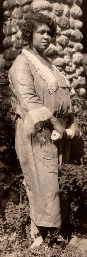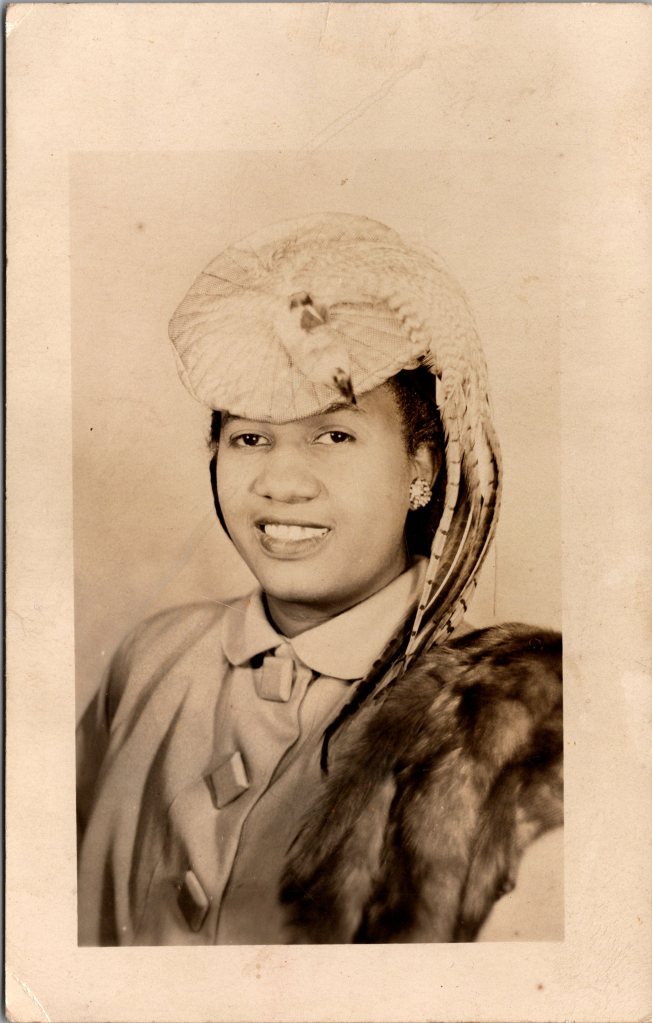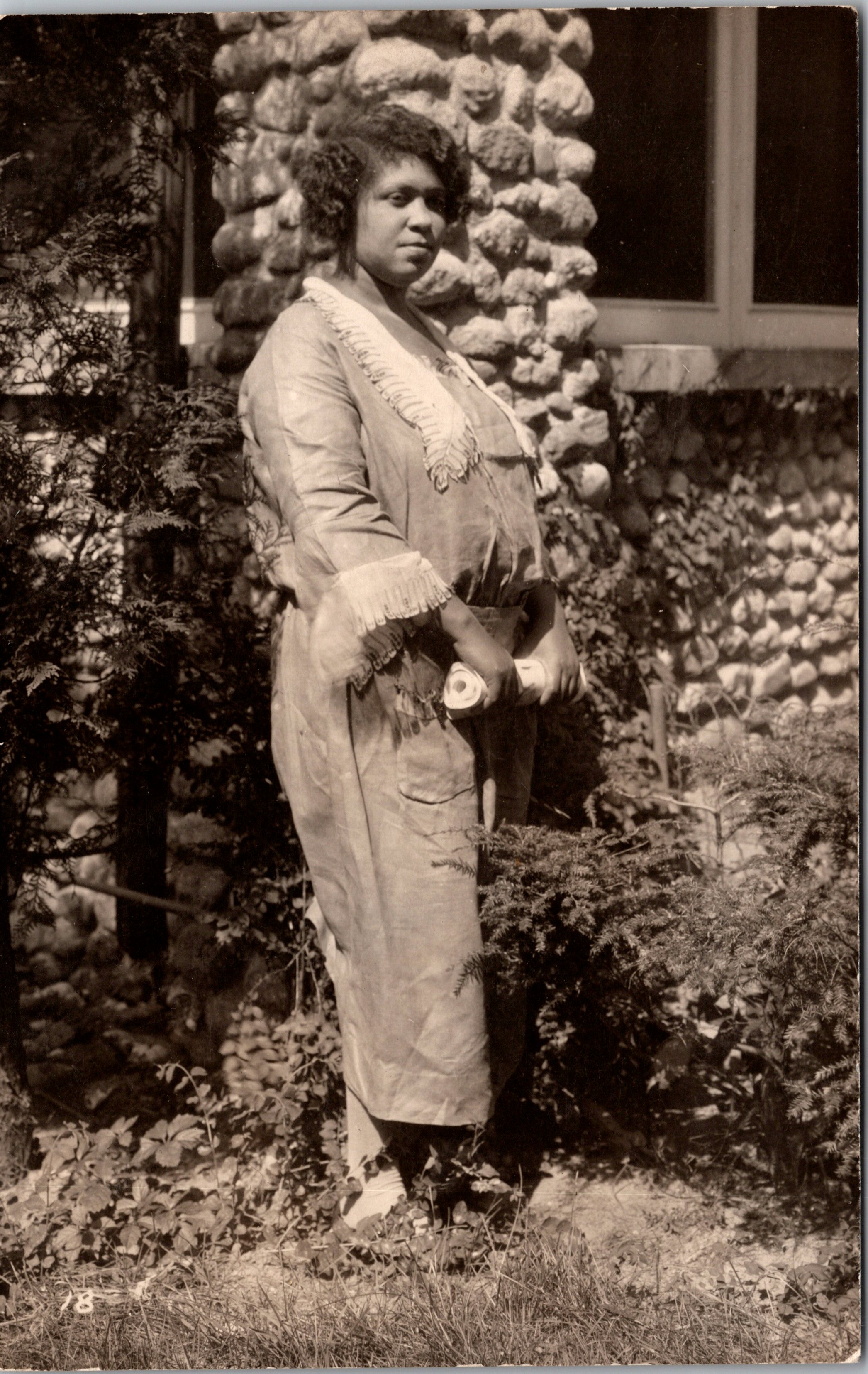 This vintage real photo postcard features an African American woman standing in a garden. She is standing in front of a stone house. The woman is holding a cylindical object in her hands. Perhaps it is a diploma or a rolled up magazine or newspaper. This vintage postcard is likely one-of-a-kind and is in very good condition (see scans). SOLD