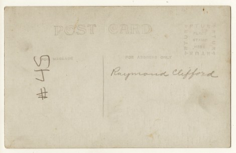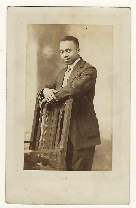 A young African American man is featured in this vintage real photo postcard. He is well dressed and has a pleasant smile. The photographer and the location of the studio is unidentified. The name “Raymond Clifford” is written on the reverse of the postcard. It is likely the name of the young man in the photograph. The postcard has an “Artura” stamp box indicating that the photograph was taken sometime between 1910 and 1924. (SOLD)