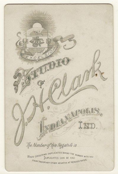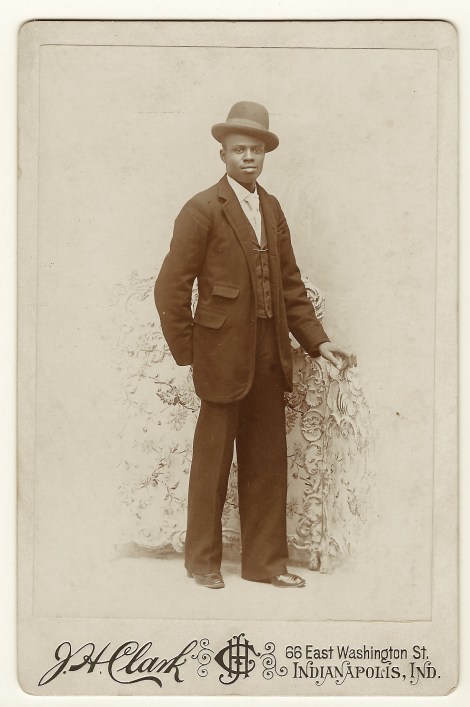 This cabinet card portrait features a young African American man. He is well dressed in a three piece suit and wearing a pocket watch. His hat appears to be strategically tipped, and indeed, he does look quite debonaire. This photograph is especially nice because it offers a full portrait of this handsome gentleman. It is difficult to find cabinet card photographs of African Americans that are in excellent condition. Many African Americans did not have the means to have their images taken and did not have easy access to photographer’s studios. This photograph was taken at a studio belonging to James H. Clark. The studio was located in Indianapolis, Indiana. He is listed as a photographer in Indianapolis directories from 1889 through 1900. SOLD