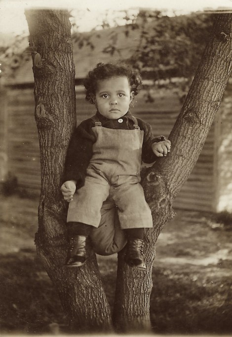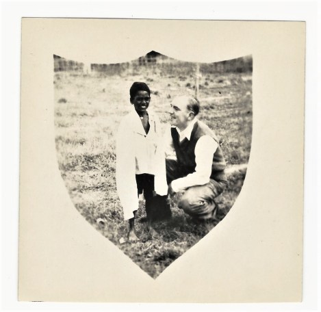 This vintage photograph features a young black boy and a middle aged white man sharing a warm moment and a laugh. The pair seem to have a close relationship. Both are smiling and seem very relaxed as they experience their interaction. The child is wearing a shirt that is much too large for him. Perhaps the shirt is a hand-me-down from an older brother. The boy is barefoot. I am very curious about why this man and child ended up together and in conversation when this photo was taken. They appear to be standing in a field but their location is unidentified. The photo measures about 3 3/4″ x 3 3/4″. SOLD
