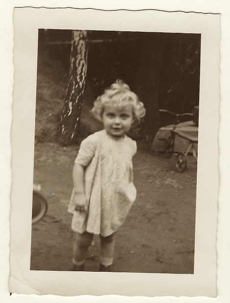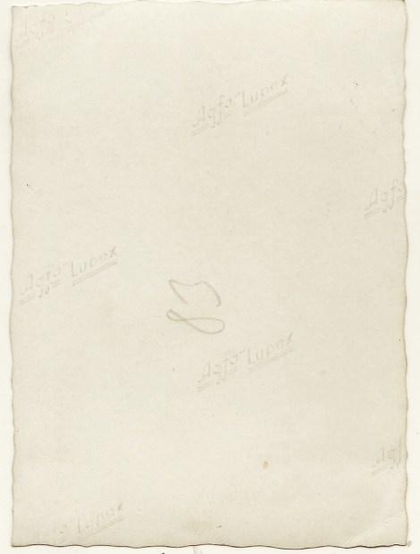 A pretty little blonde girl is the subject of this vintage snapshot photograph. She has a cherubic smile and curly hair. Apparently, she also has an itch. Note the tricycle in the background. This photo is printed on agfa lupex photo paper. This paper was produced in Germany sometime after 1945.The image measures about 2 5/8″ x 3 5/8″ and is in very good condition (see scans).